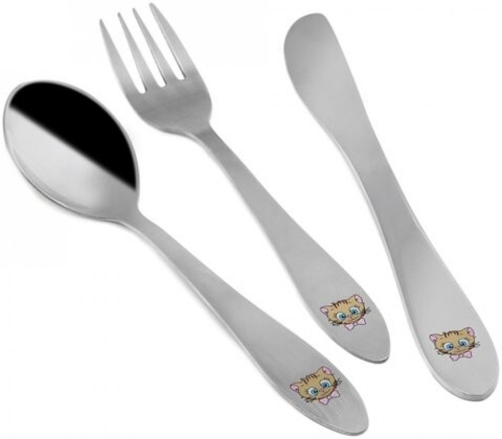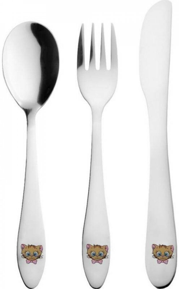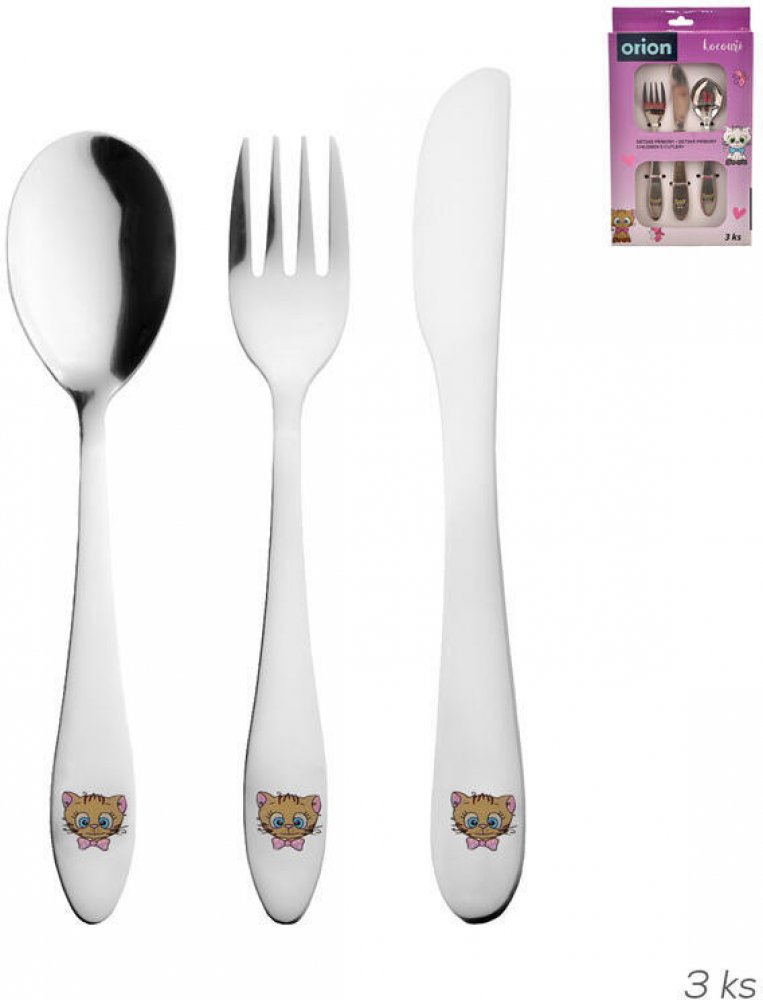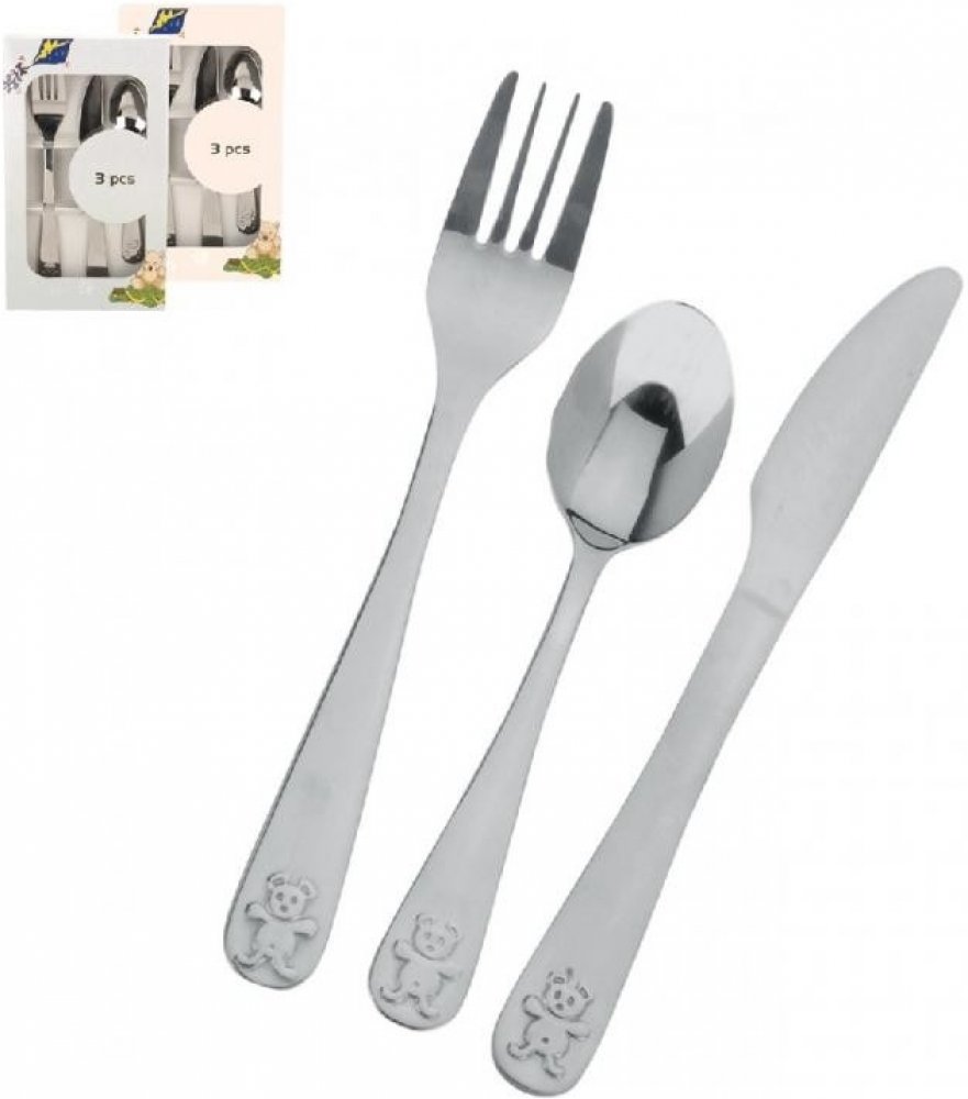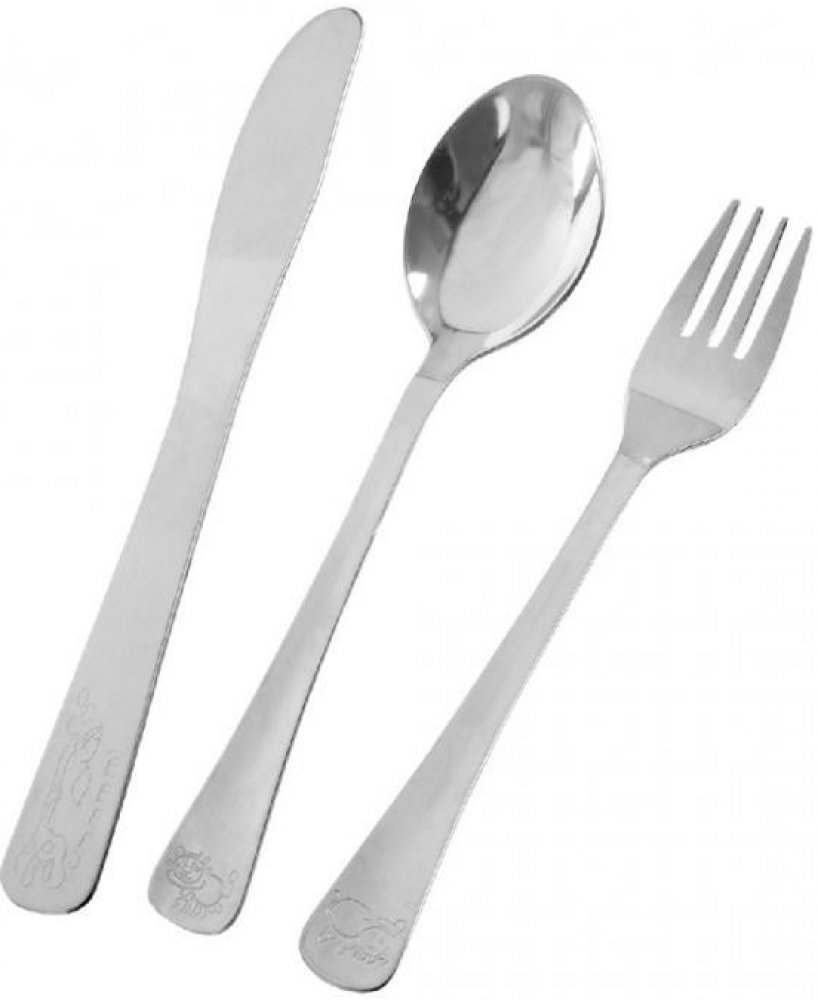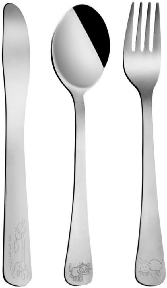 Tvar přizpůsoben dětem Sada dětských nerezových příborů s reliéfem zvířátek a zaoblenými špičkami. Vhodné pro první samostatné návyky stolování. Sada obsahuje lžíci, vidličku a nůž. Materiál: nerez Rozměr lžíce: 15,5 cm Rozměr vidličky: 16 cm Rozměr nože: 17 cm Vhodné do myčky nádobí: ano
