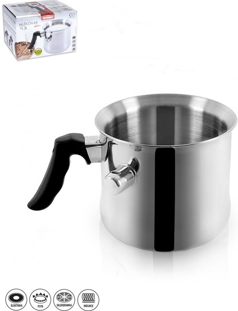 Mlékovar s dvojitou stěnou - mezi stěny nalijete vodu, která brání připálení mléka i různých omáček. Tvarované plastové držadlo a píšťalka, která upozorní na vařící se vodu. Vhodná na všechny typy tepelných spotřebičů kromě indukce.
