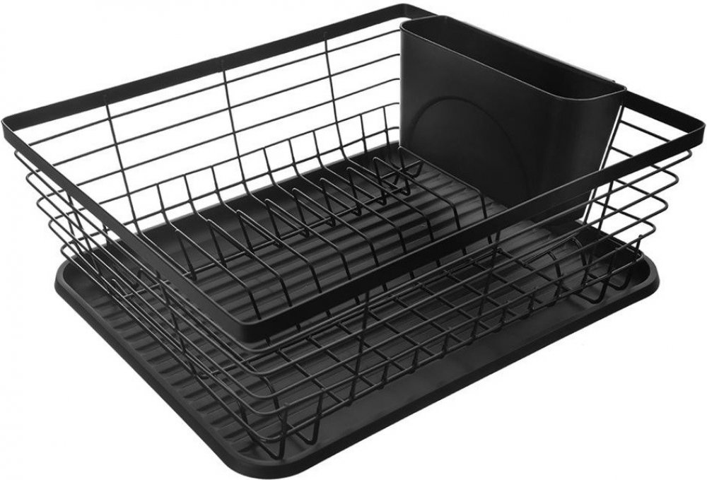 Odkapávač na nádobí s konstrukcí na odkládání talířů a příborů doplněný tácem.