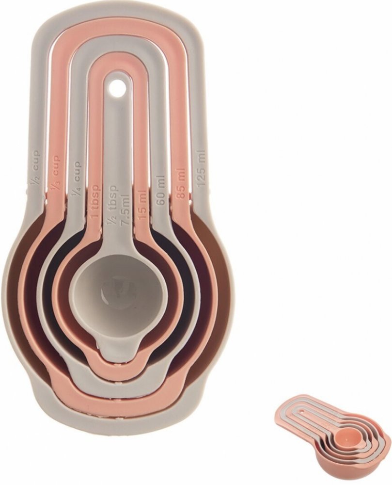 Sada 5 odměrek pro měření malých objemů je skvělým pomocníkem při pečení a vaření přesně podle receptů. Jednotlivé odměrky do sebe zapadají, což je velmi praktické pro ukládání, jsou spojeny řetízkem, ale dají se z něho velmi snadno sundat a jednotlivě použít. Materiál: plast PP. Rozměry: 7,5 ml/1/2 tbsp (lžíce), d. 9,8 cm, š. 3,2 cm, 15 ml/1 tbsp, d. 11 cm, š. 4,4 cm, 60 ml/1/4 cup (hrnku), d. 12 cm, š. 5,5 cm, 85 ml/1/3 cup, d. 13,3 cm, š. 6,7 cm, 125 ml/1/2 cup, d. 14,5 cm, š. 8 cm. Lze mýt v myčce.
