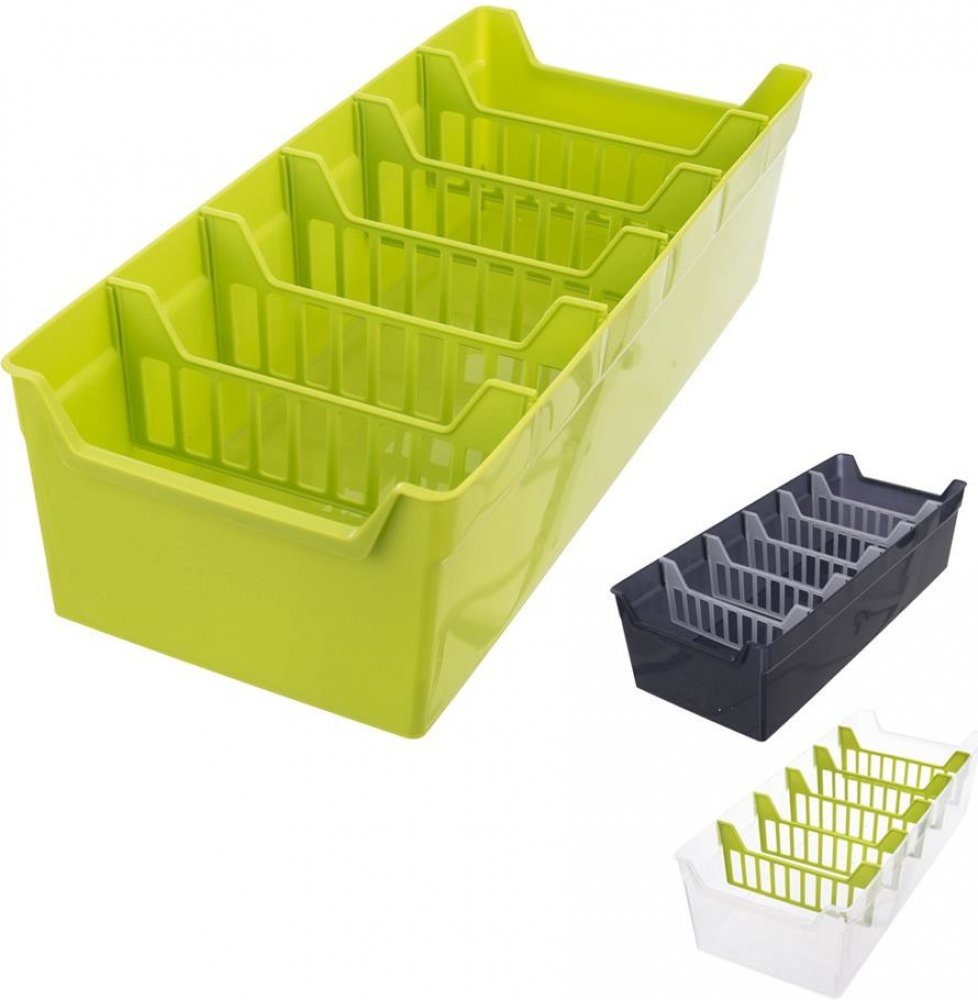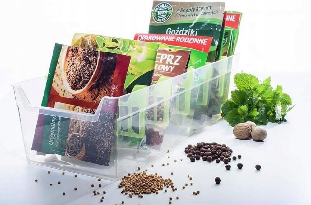 Plastový zásobník do kuchyně, který zajistí přehledné uspořádání sáčků s kořením.