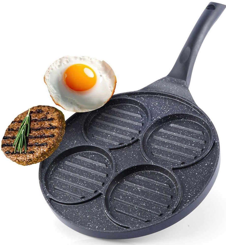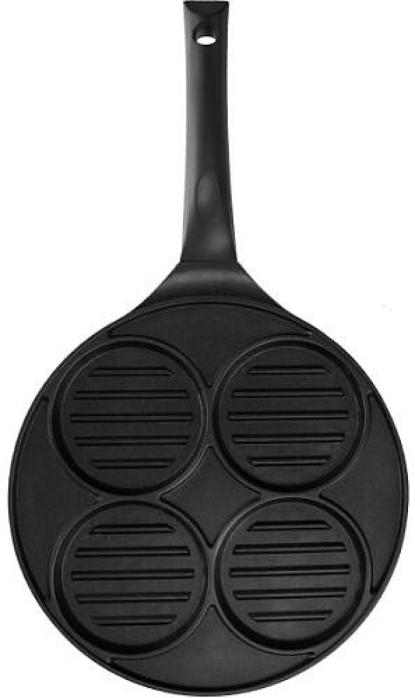 Pánev na hamburgery je odlévaná masivní pánev se sníženým okrajem a s velmi kvalitním nepřilnavým povrchem PFLUON GRANIT. Je určena pro přípravu masových i zeleninových placiček s minimální potřebou tuku. Čtyři sekce, vroubkované dno sekcí. Materiál: hliník s vynikajícím nepřilnavým povrchem PFLUON GRANIT a s profilovaným dnem, plastové držadlo. Možnost zavěšení. Rozměry: pr. 26,5 cm, v. 1,8 cm, pr. jedné sekce 10 cm. Vhodná na všechny typy spotřebičů včetně indukce. Lze mýt v myčce na nádobí. Doporučujeme použití kuchyňské chňapky.
