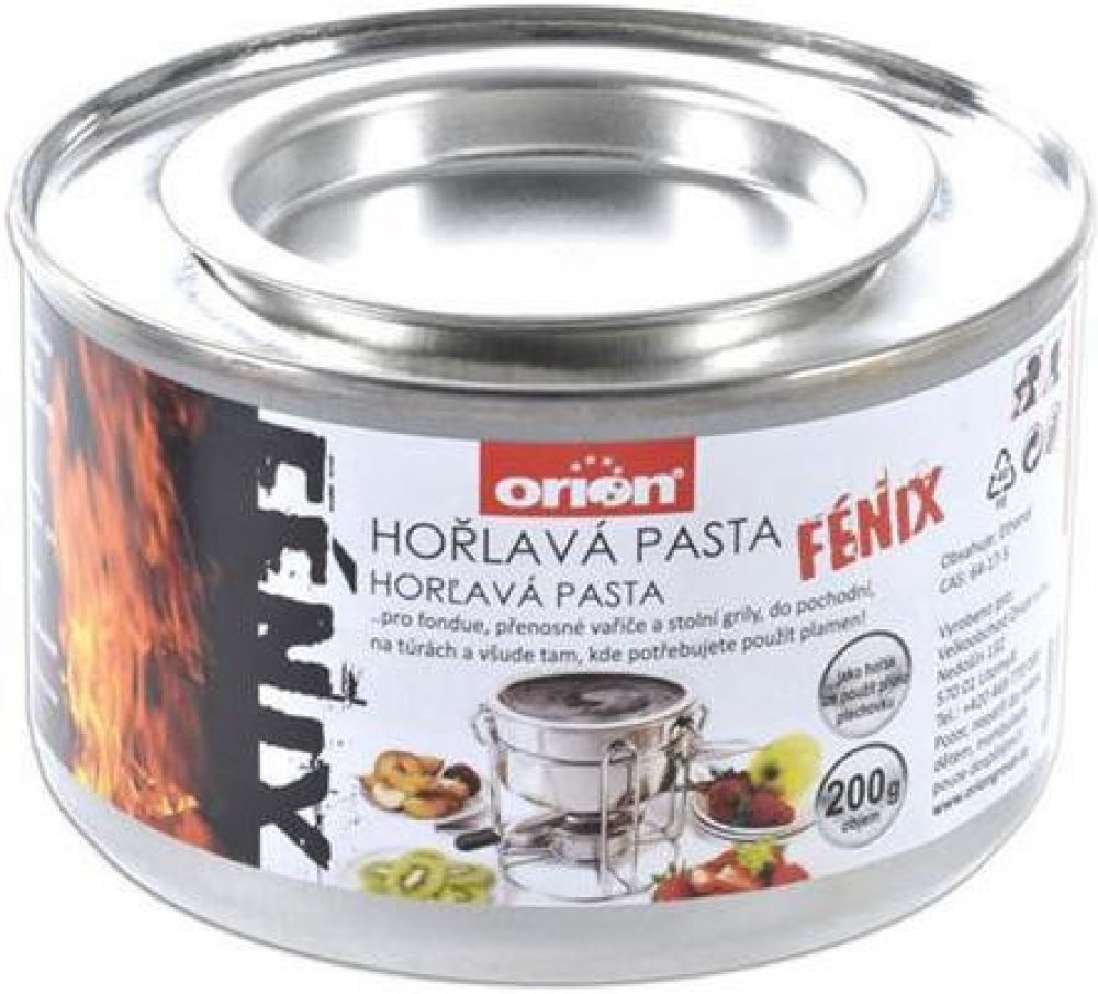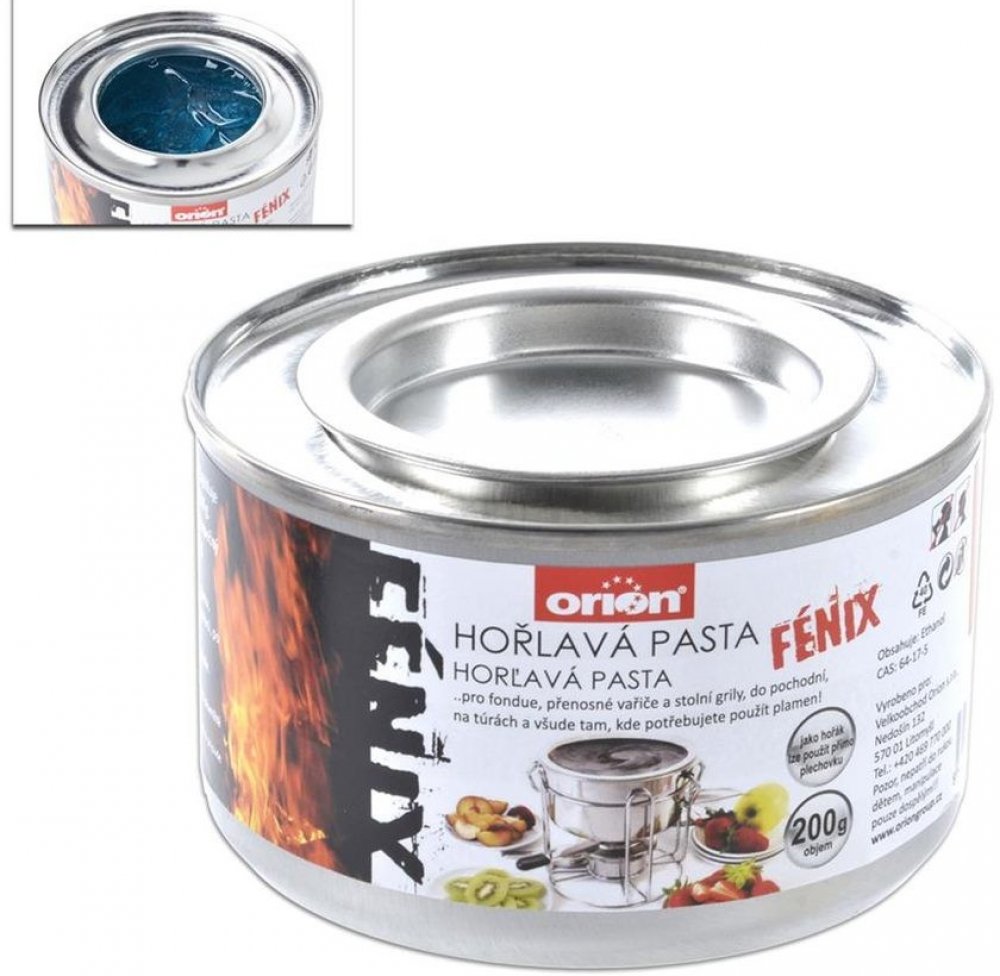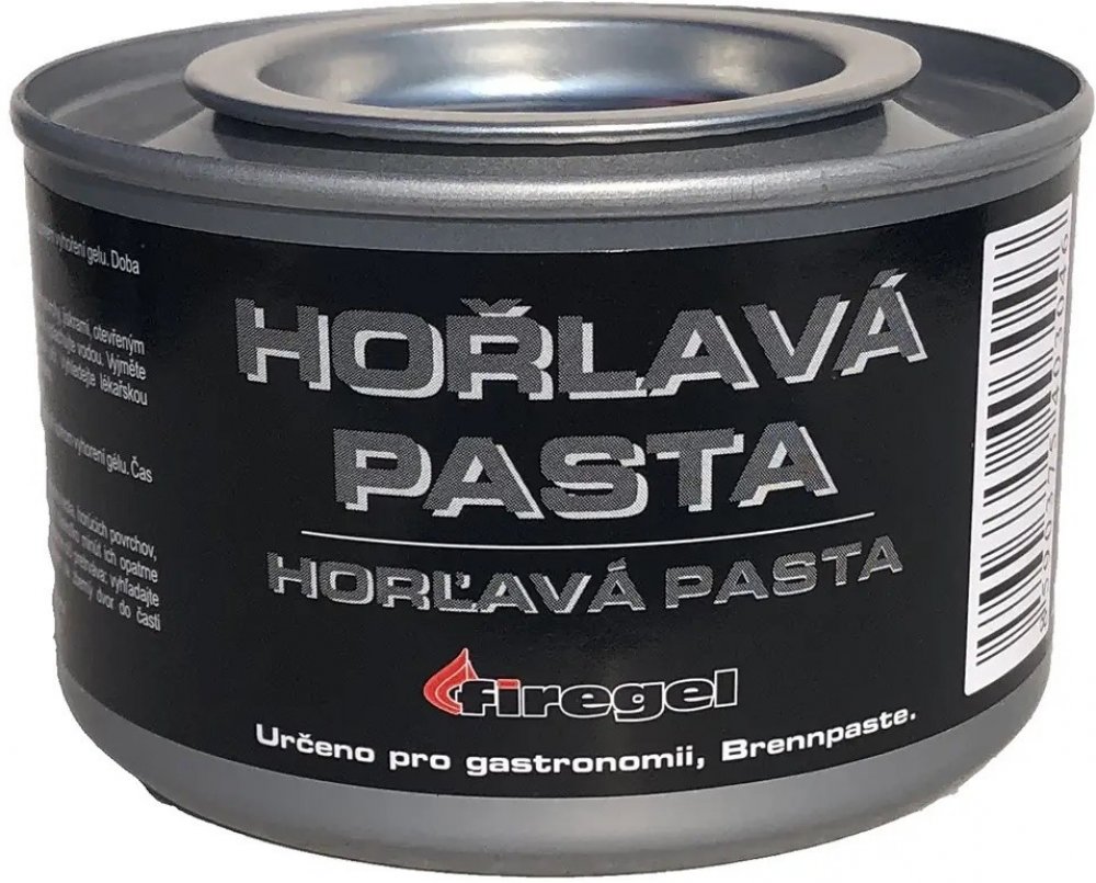 Ethanolová hořlavá pasta Želírovaný methylalkohol (ethanolová báze). Hoří zcela beze zbytků, bez zápachu a sazí. Pasta je nevýbušná, netoxická, snadno se s ní manipuluje a je bezpečná. Hodí se také do různých držáků na opékací misky. Ideální pro zapalování ohně nebo předehřívání kamen a lamp. Krátké proužky zapalovací pasty na benzinových nebo petrolejových kamnech usnadňují proces zapalování. vl...