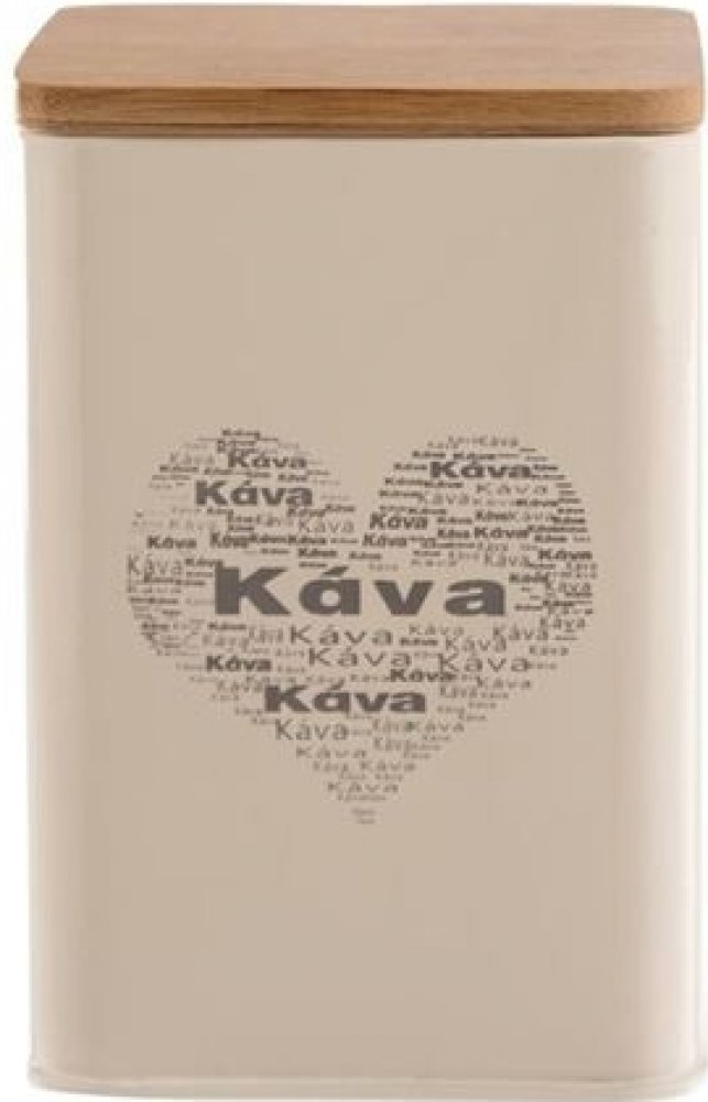 Dóza hranatá s víčkem na uložení kávy. Materiál: plech dřevěné víčko. Rozměry: 95x95x14 cm.