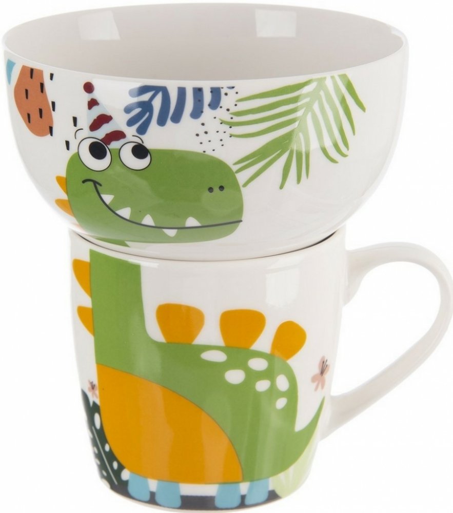 Tato rozkošná sada porcelánového hrnku a misky Dino od značky Orion přináší radost na každý stůl. Hravý motiv veselého dinosaura propojuje misku s hrnkem tak, že spolu tvoří krásný celek, který ocení nejen děti, ale i dospělí. Hrnek o objemu 350 ml je ideální na čaj, kávu s mlékem nebo kakao, zatímco miska o objemu 600 ml perfektně poslouží na cereálie, ovoce, jogurt nebo salát. Díky tomuto propo...