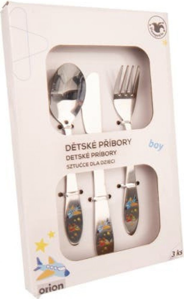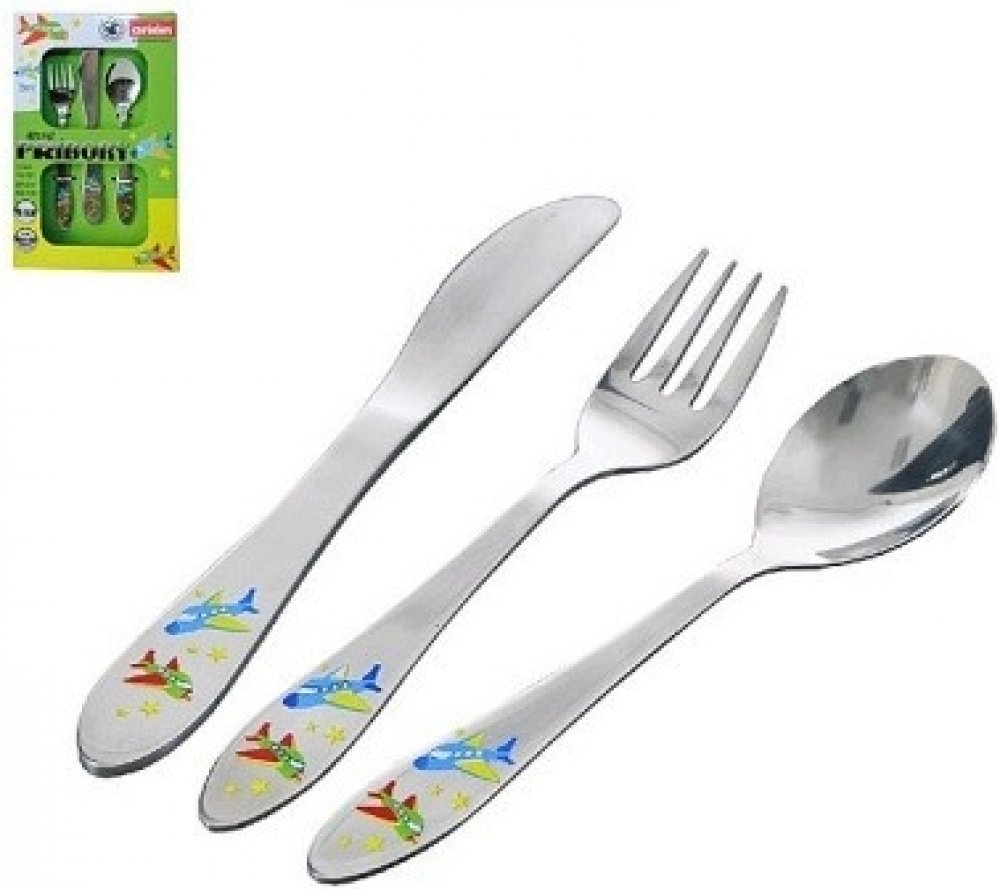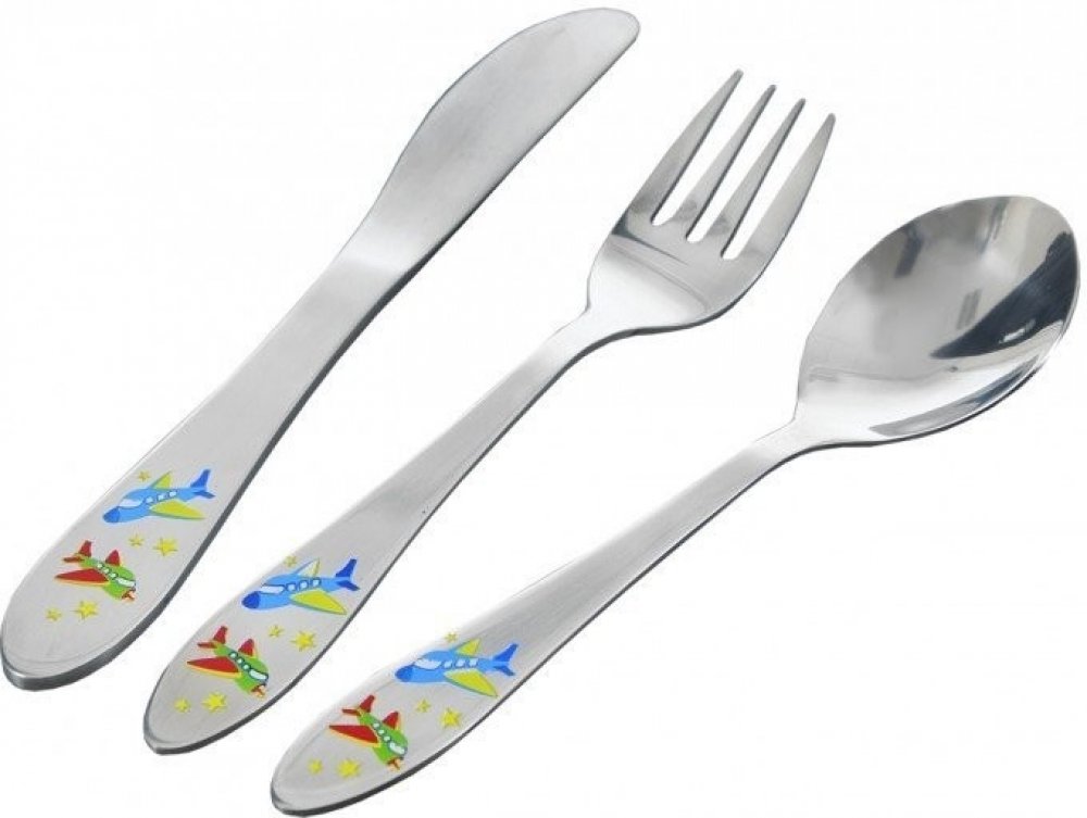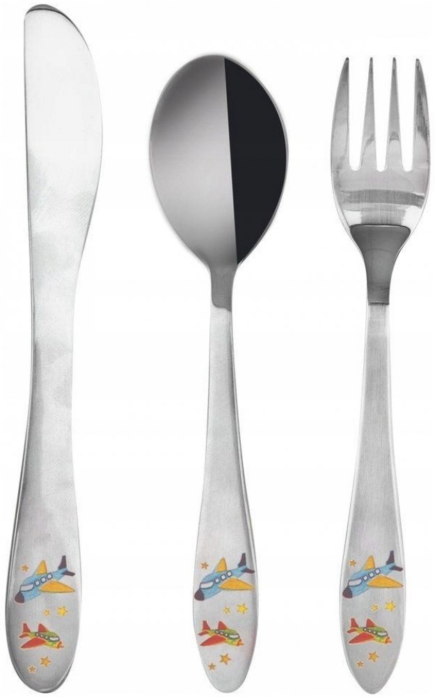 Dětský příbor s barevným dekorem letadel pro kluky. Tvar přizpůsobený dětem. Lze mýt v myčce na nádobí, ale nedoporučujeme, mohlo by dojít k porušení barevného dekoru, což později nemůže být důvodem reklamace.