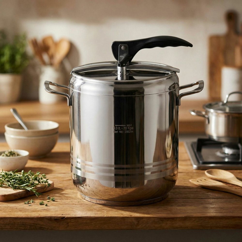 Tlakový hrnec s tlakovou poklicí rovného tvaru je opatřen silným 3vrstvým akutermickým dnem, které díky svým vlastnostem spoří výrazně tepelnou energii i čas strávený při přípravě pokrmů. Hrnec je opatřen pružným víkem s tvarovanou rukojetí a bezpečnostním a pracovním ventilem pro upouštění tlaku. Max. výška naplnění hrnce j