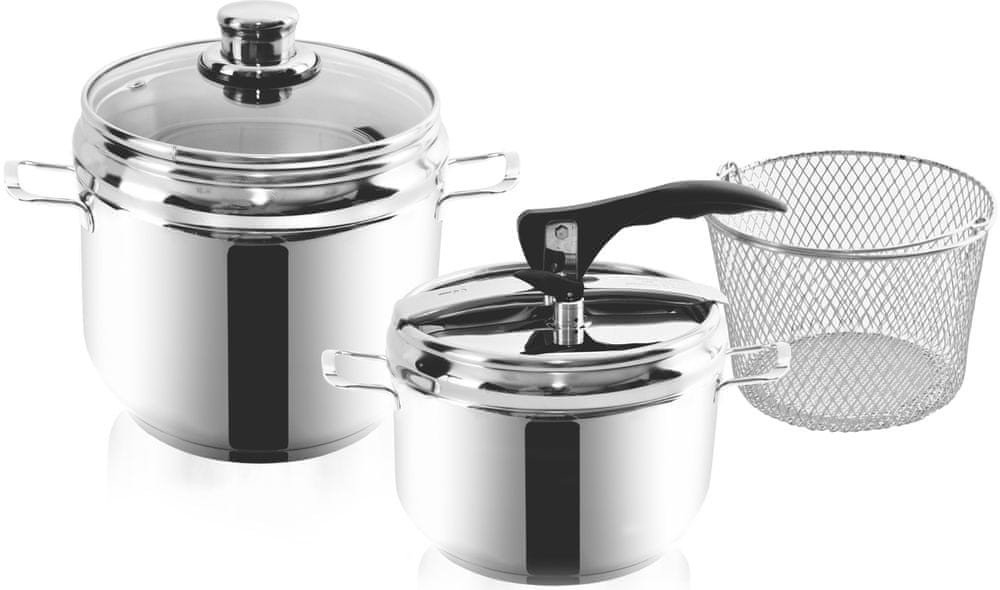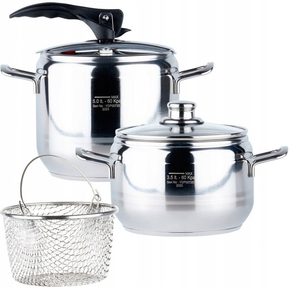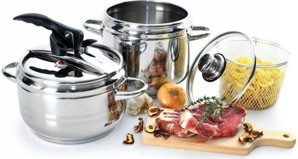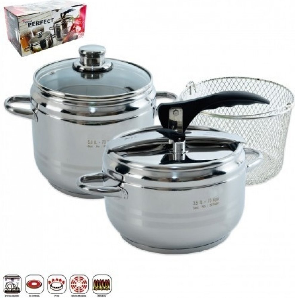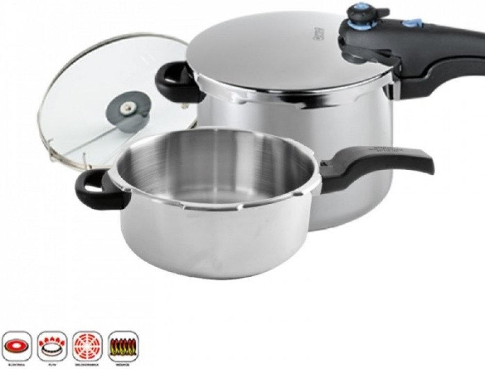 Hrnce tlakové DUO jsou vyrobené z kvalitní nerezové oceli. Jsou opatřeny sendvičovým dnem, díky kterému budete pokrm připravovat kratší dobu a ušetříte tak energie. Tlaková poklice s 2 bezpečnostními ventily. Součástí hrnce je i skleněná poklice a nerezový košík na cezení uvařených potravin. Hrnce jsou vhodné na vše