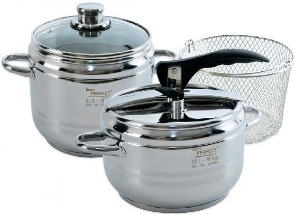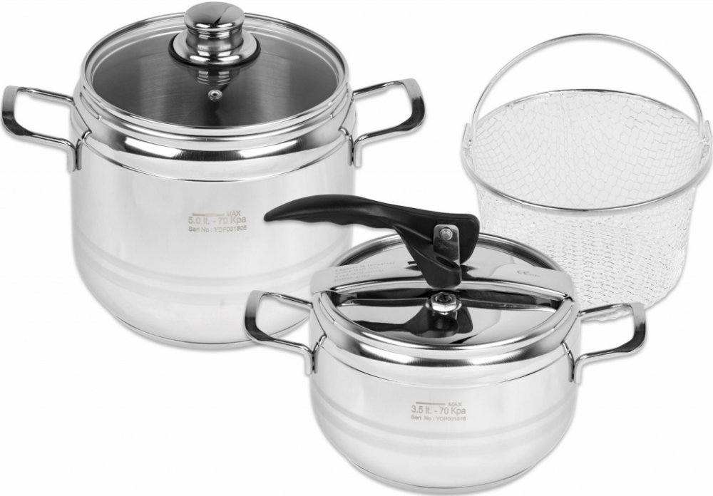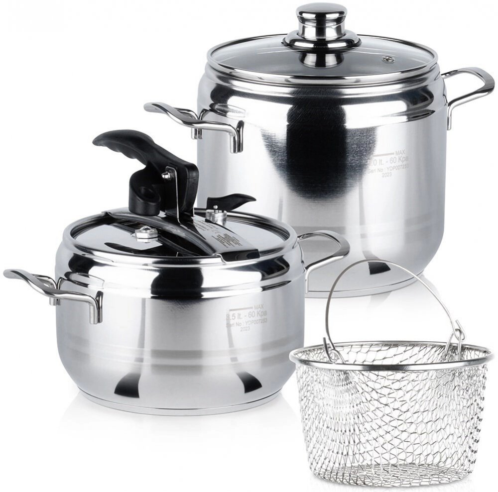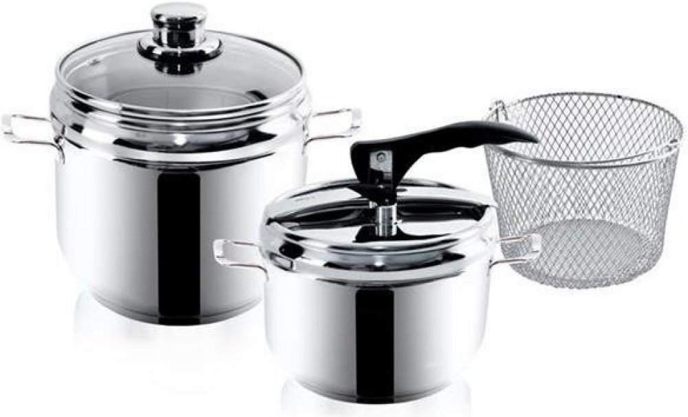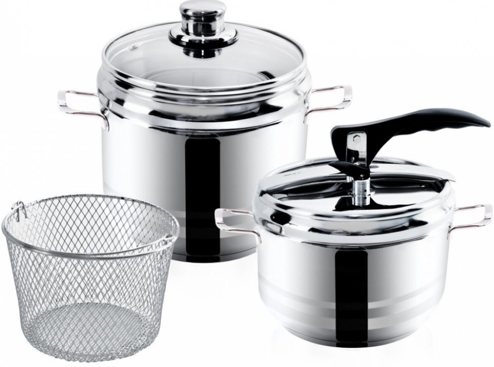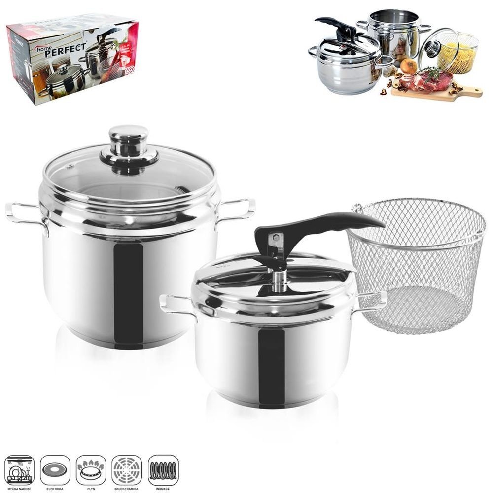 Hrnce tlakové DUO jsou vyrobené z kvalitní nerezové oceli. Jsou opatřeny sendvičovým dnem, díky kterému budete pokrm připravovat kratší dobu a ušetříte tak energie. Tlaková poklice s 2 bezpečnostními ventily. Součástí hrnce je i skleněná poklice a nerezový košík na cezení uvařených potravin. Hrnce jsou vhodné na vše