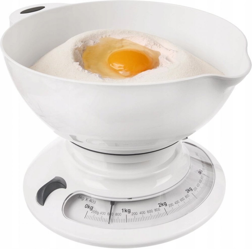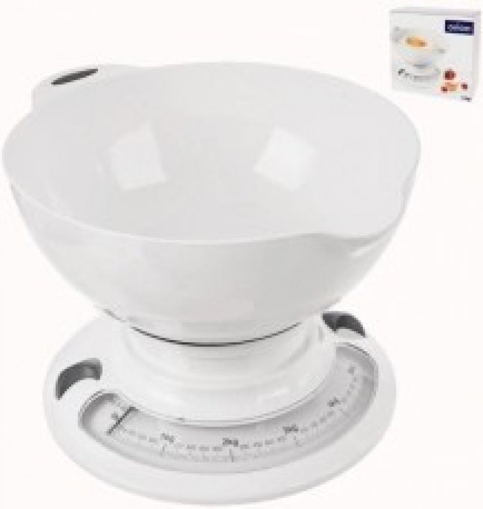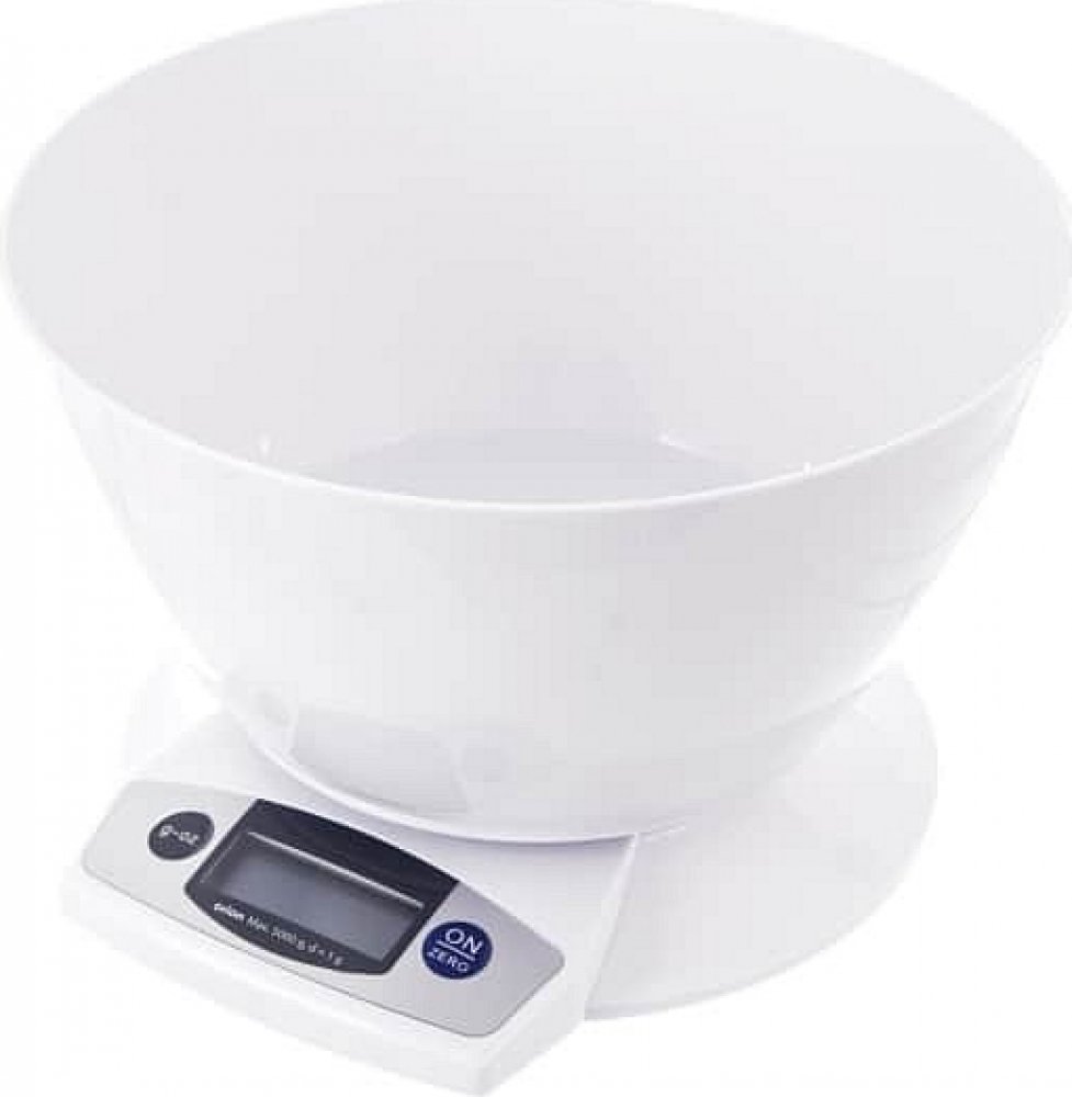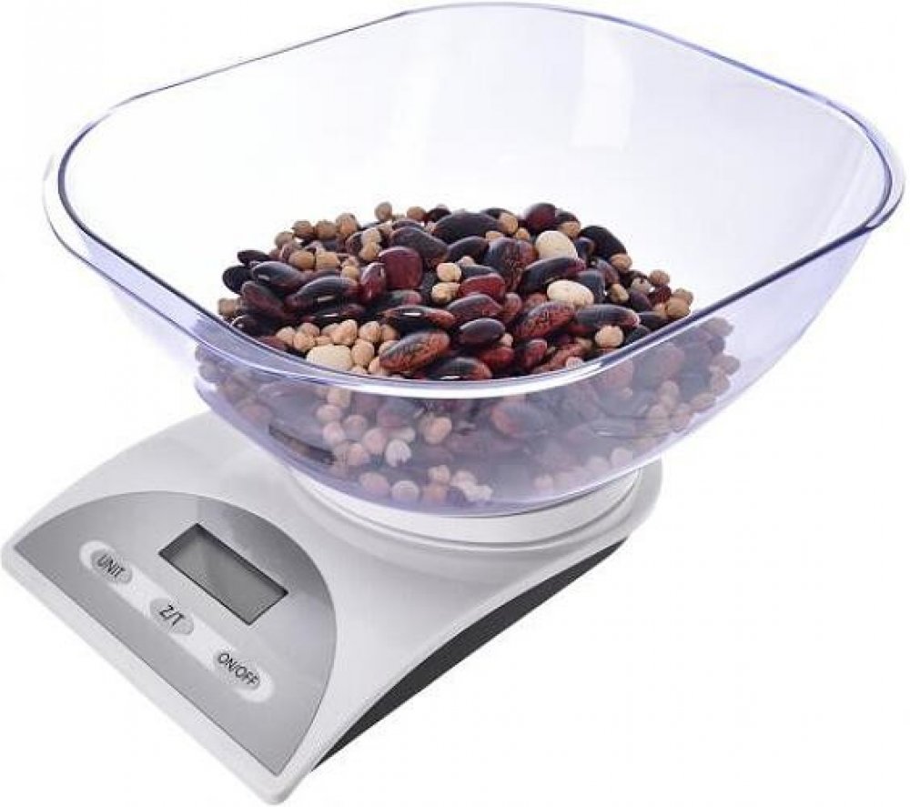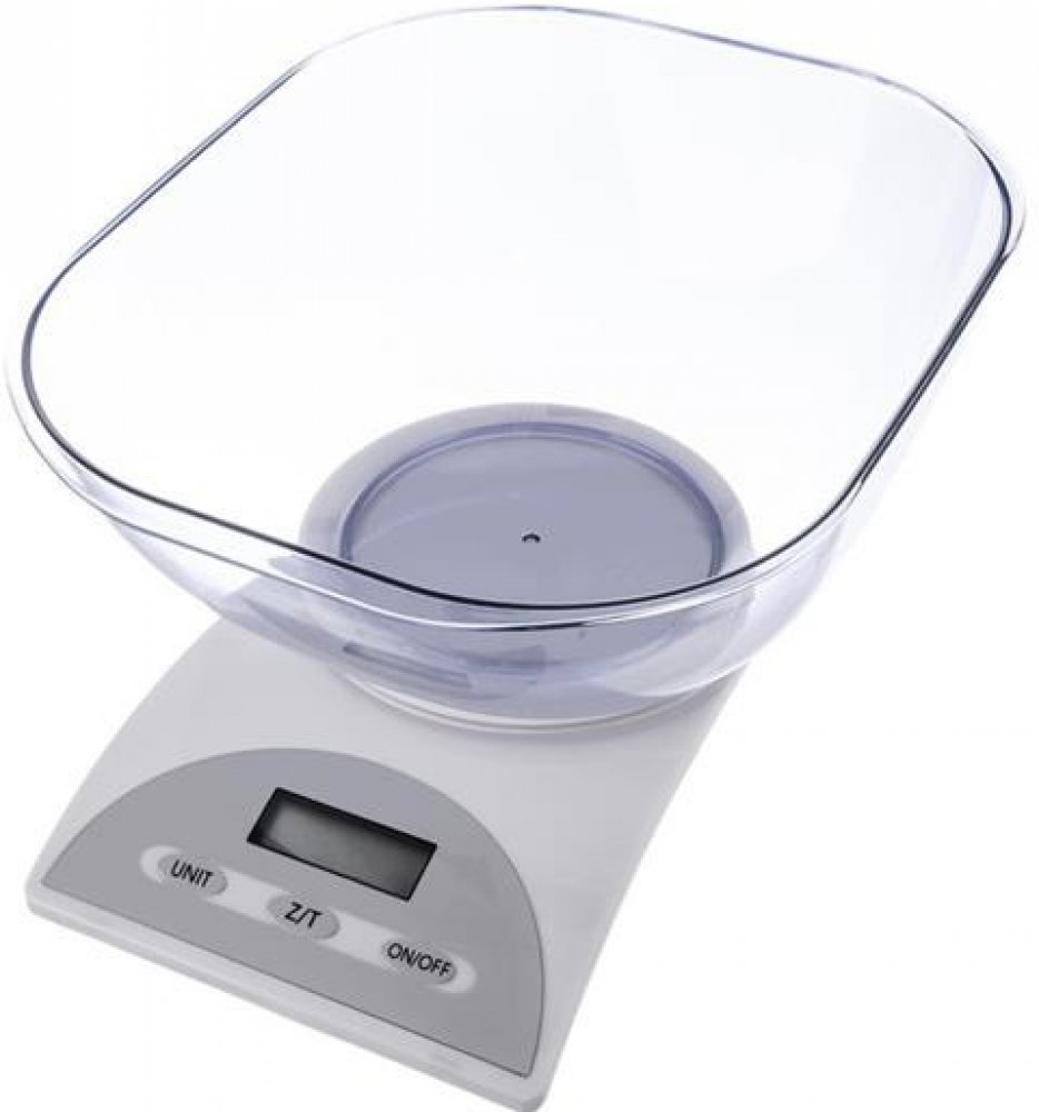 Kuchyňská váha s digitálním LCD displejem. Max na 5 kg. 1 díl = 1 g. Funkce: vážení v kg, g, lb, oz, dovažování, indikátor slabé baterie a přetížení, automatické vypnutí. Misku je možné nahradit jinou nádobou. Napájení na 2x1,5 V AAA (nejsou součástí).