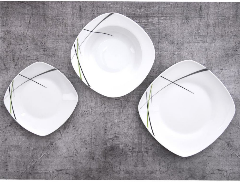 Pokud toužíte po sladěné jídelní sadě, která vylepší servírování vašeho jídla, máme pro vás tento set 18 porcelánových talířů hranatého tvaru.