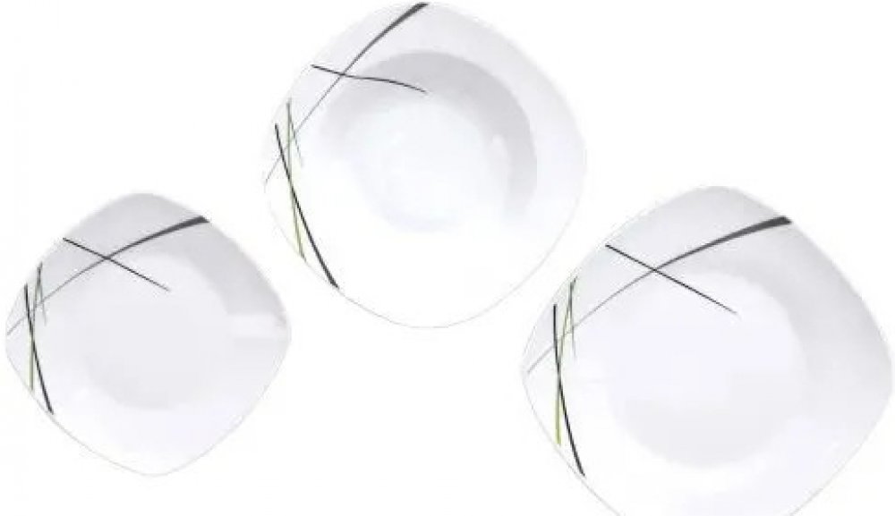 Obsahuje šest dezertních talířů o rozměrech 18,5×18,5 cm, šest mělkých talířů o rozměrech 24×24 cm a šest hlubokých talířů o rozměrech 21×21 cm, které mají po stranách jemný dekor černo-zelené barvy.