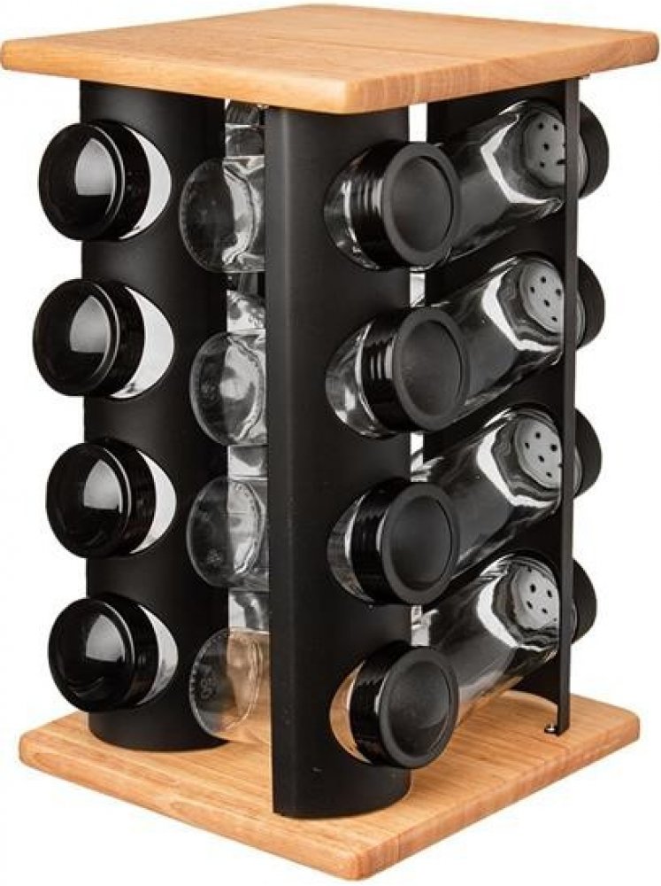 16dílná sada kořenek je uložena v otočném stojanu, ze kterého je snadno vyjmete a do něj opět uložíte. Máte skvělý přehled o uloženém koření. Zabere velmi malý prostor. Vlastnosti:- Materiál: stojan - dřevo, nerez s černým povrchem, skleněné kořenky jsou opatřeny plastovými sypátky a uzávěry na závit- Rozměry: stojan – 17,5x17,5x29,5 cm, kořenka - objem 0,08 l, pr. 4,5 cm, v. 10 cm- Skleněné kořenky (bez víček a sypátek) lze mýt v myčce na nádobí