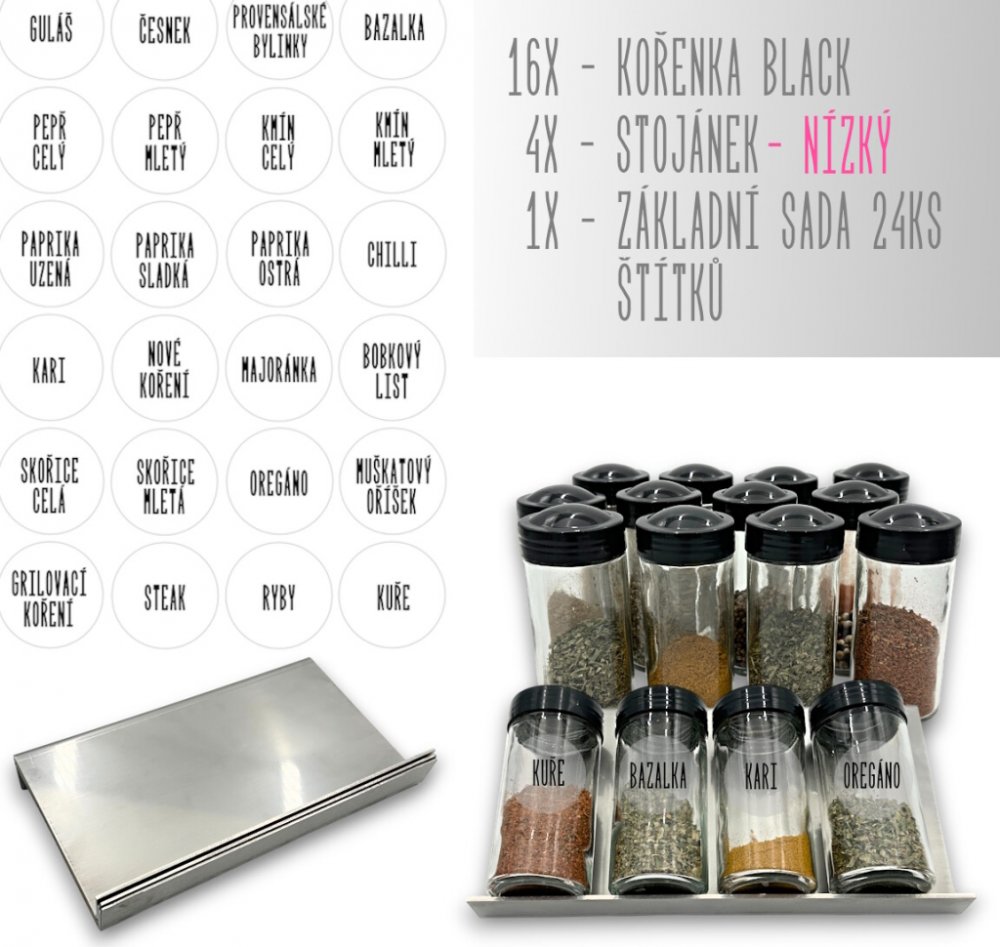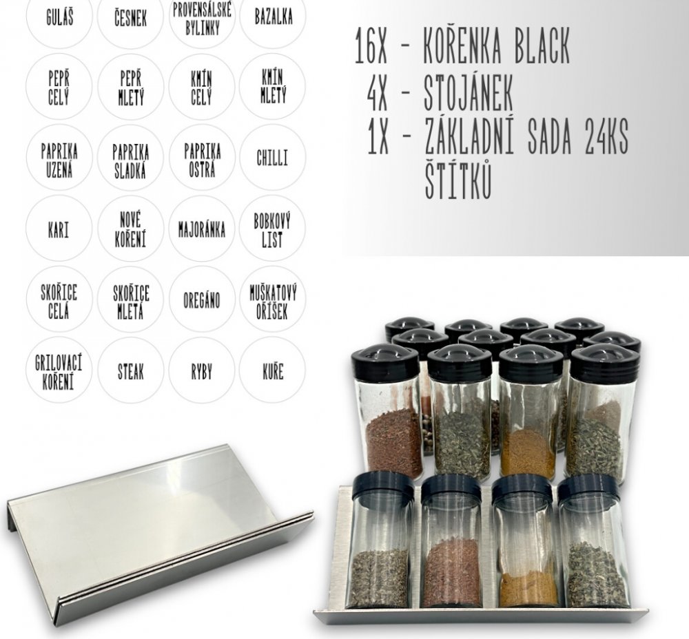 Sada 16 ks kořenek Black 80 ml s černým víčkem na závit + 4 ks nerezový organizér na kořenky VASKY + sada 24 ks štítků