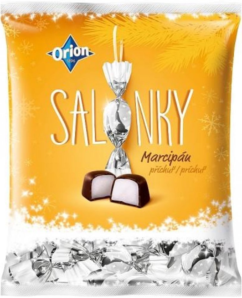Fondánová cukrovinka 75 % s marcipánovou příchutí máčená v hořké čokoládě 25 %.