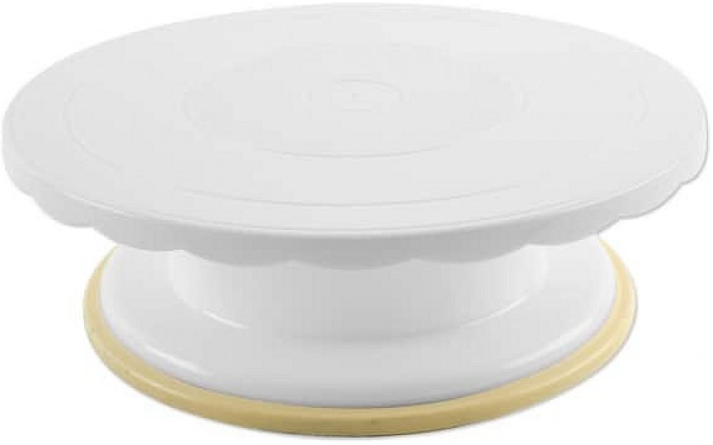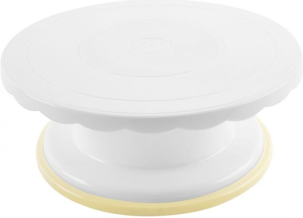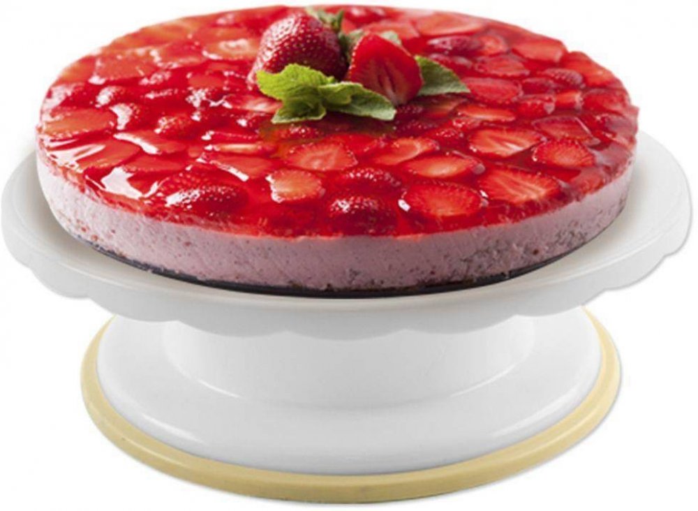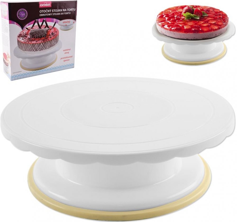S tímto otočným stojanem bude zdobení vašich dezertů úplná hračka. Má průměr 28 cm a jeho podnos i vyšší podstavec jsou vyrobené z kvalitního plastu. Během vyhlazování potahovací hmoty, přípravy nahých dortů i jejich zdobení je možné s tácem otáčet, díky čemuž bude zdobení snadnější. Vzhledem k tomu, že se jedná nejen o velmi praktický, ale i stylový kousek, můžete na něm váš dezert rovnou servíro...