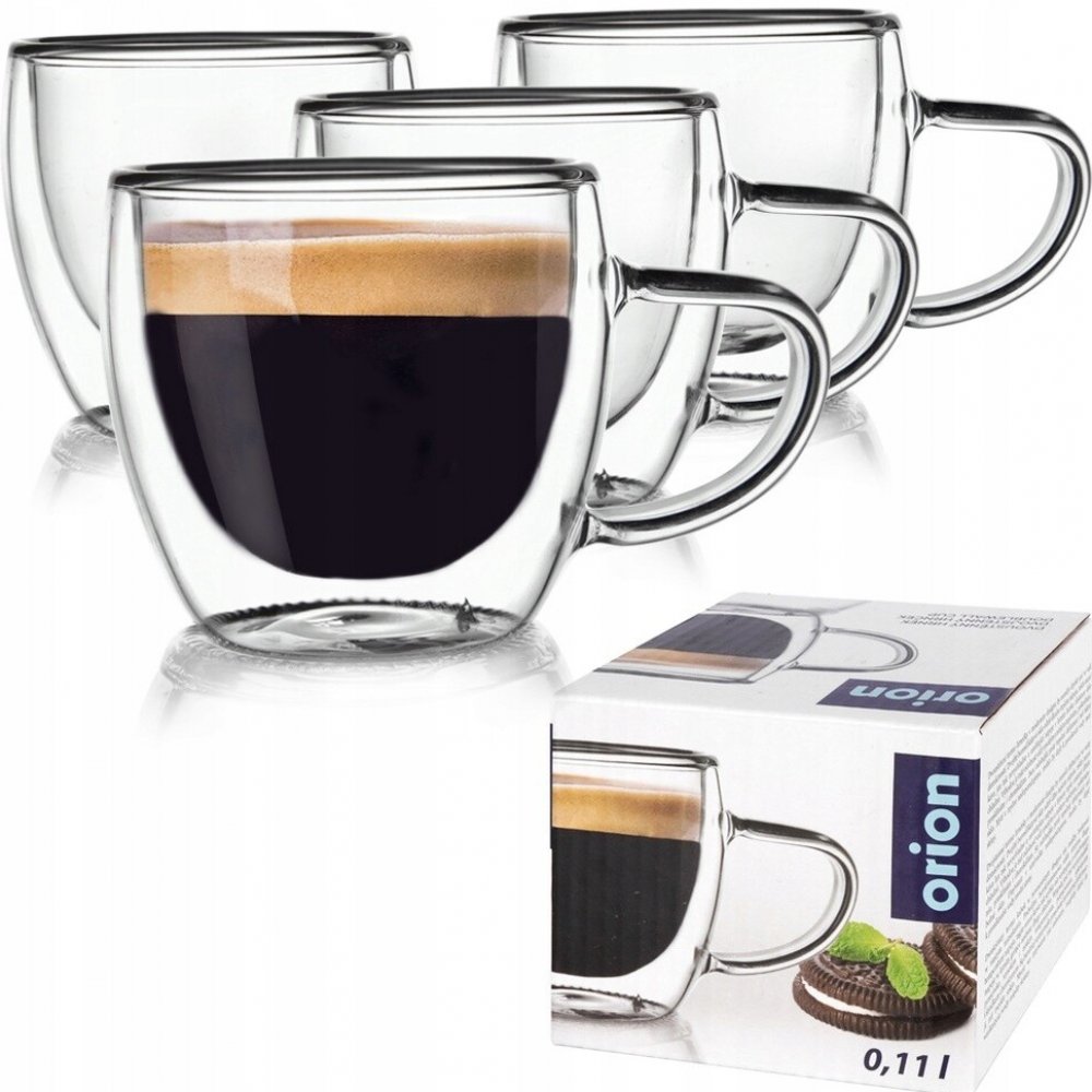 Sada čtyř termosklenic s dvojitou stěnou. Sklenice mají moderní design a po nalití nápojů do nich je vizuální efekt úžasný. Díky dvojité stěně nás horké nápoje nebudou vařit v ruce a sklenice nám umožní udržet teplotu déle, což platí i pro studené nápoje. Ideální pro pití espressa. Sklenice jsou vhodné jak pro dospělé, tak i pro děti. Nejsou vhodné pro mytí v myčce nádobí. Sklenice jsou baleny v krabičce, takže jsou ideálním nápadem na dárek. Originální výrobek české značky Orion. Vyrobeno v souladu s evropskými normami.