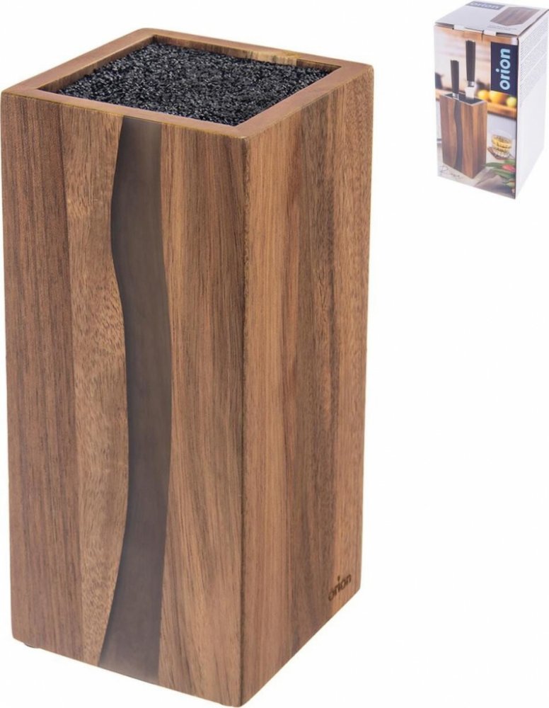 Praktický stojan na všechny nože - Stojan na nože o rozměrech 11 x 11 x 23,5 cm ze série River. Stojan umožní správné uložení nožů jakéhokoli typu včetně: ocelových, keramických nebo ocelokeramických. Stojan ze série River. Vyrobeno z akátového dřeva - Vyrobeno z nejkvalitnějšího akátového dřeva s prvky pryskyřice, která je zapuštěna do dřeva a svým tvarem připomíná řeku. Výplň stojanu je vyrobena z odolného plastu v černé barvě. Akátové dřevo, je ekologický a zdravotně nezávadný materiál. Výrazný dekorativní prvek - Stojan se v kuchyni elegantně prezentuje. Je to výrazný dekorativní prvek do kuchyně. Udržovaný v klasickém stylu bude vypadat krásně v každém interiéru. S jeho pomocí budou mít nože své určené místo. Čtyři protiskluzové podložky - Je vybaven protiskluzovými podložkami, které zabraňují klouzání po pracovní desce a chrání desku před poškrábáním. Dostatečný úložný prostor pro nože - Můžete do něj uložit nože libovolného tvaru čepele i nůžky nebo lžíce. Uvnitř stojanu je vyjímatelná plastová štětina, takže je univerzální a přizpůsobitelný různým nožům nebo nůžkám bez rizika jejich otupení.Stojan na nože a kuchyňské náčiní vyrobený z odolných materiálů. Je mimořádně nápaditý, bude ozdobou každé kuchyně a zároveň umožní správné uložení nožů. Má moderní design, takže se bude hodit do kuchyní v moderním stylu, ale i v klasickém stylu. Originální výrobek české značky Orion. souladu s evropskými normami. Jedinečná kolekce RIVER spojuje nádherné akáciové dřevo se specifickou, výraznou kresbou a moderní pryskyřici (resin) Ta se vine, rozlévá jako průhledná řeka v jemném šedém odstínu.Kdo má slabost pro originální, stylové kousky, ten rád sáhne i po stojanu na nože. Kovové nože, nůžky, ocílka apod. budou uloženy mezi plastovými štětinami. Na rozdíl od uložení v zásuvce, kde se může třením a posunem v příbornících ostří tupit, budou nejpoužívanější nože bezpečně uloženy v bloku. Stačí je jen vzít a začít krájet. Ze spodní strany má pěnové podložky, které zabraňují posunu po stole a jeho poškození. V případě potřeby stojan umyjte běžným způsobem, v teplé vodě se saponátem, i štětiny lze jednoduše vyjmout, vyklepat je nebo umýt. Stojan na nože - blok, dřevěný, zásuvný, kvádrový tvar, štětiny, rozměry 230 × 110 × 105 mm (V׊×D), hnědá barva