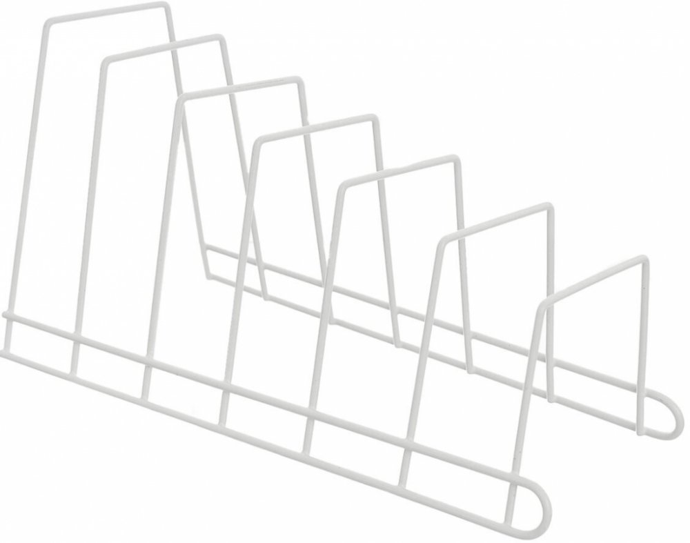 Praktický drátěný stojan s plastovou povrchovou úpravou zajistí bezpečné i přehledné uložení až 6 kusů poklic. Ať už nerezových, smaltovaných i skleněných.