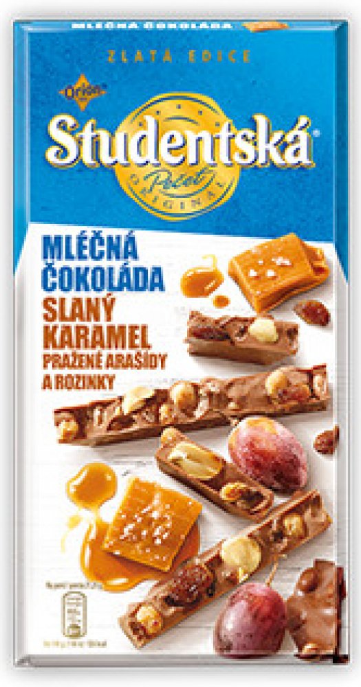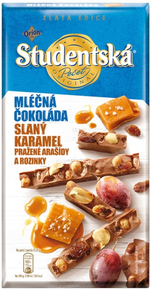 - Složení: Mléčná čokoláda (cukr, kakaové máslo, kakaová hmota, sušené plnotučné mléko, sušená syrovátka, mléčný tuk, lískooříšková pasta, emulgátor: slunečnicový lecitin; vanilkový extrakt), arašídy, rozinky, solené karamelové kousky (cukr, rostlinné tuky: palmový, shea; zahuštěné slazené odtučněné mléko: mléko, cukr; glukózový sirup, pitná voda, jedlá sůl, kukuřičná mouka). (vztaženo na složku s...