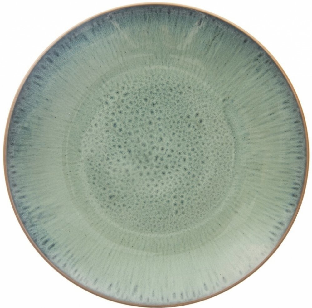 Elegantní mělký talíř o průměru 27 cm ze sklované keramiky v módní zelené s reaktivní glazurou a jemným tečkovaným dekorem. Ideální pro každodenní stolování i sváteční příležitosti, vhodný do myčky i mikrovlnky a skvěle ladí s různými typy prostírání.