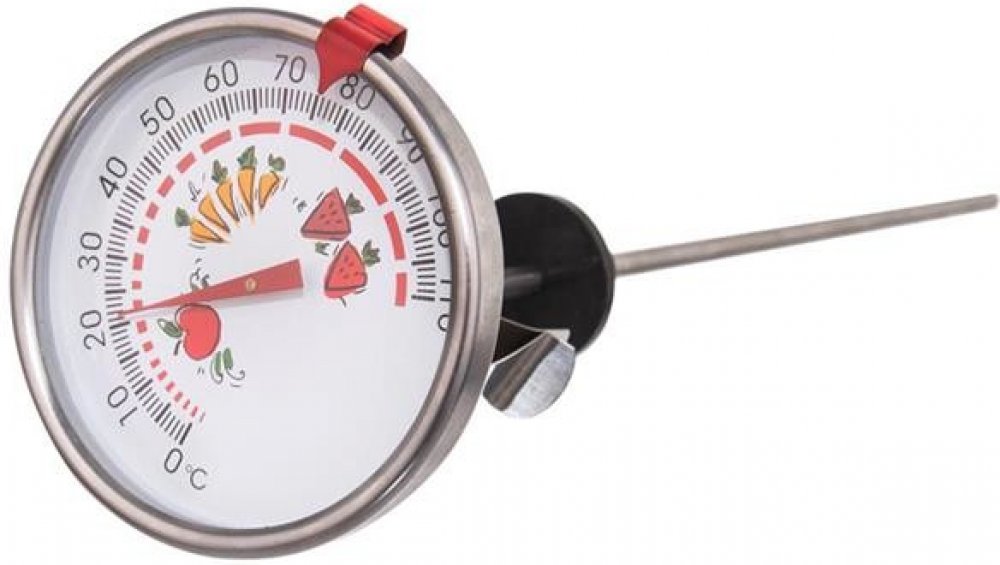 Teploměr na zavařování s klipem a gumovou zarážkou s označením teplot od 0 °C do 110 °C. Gumová zarážka slouží k upevnění do středového otvoru poklice na hrnec. Teploměr lze ale upevnit také pomocí klipu na okraj hrnce.Vlastnosti:- Materiál: nerez, sklo, hliník, guma- Rozměry: pr. 7,5 cm, d. 28 cm