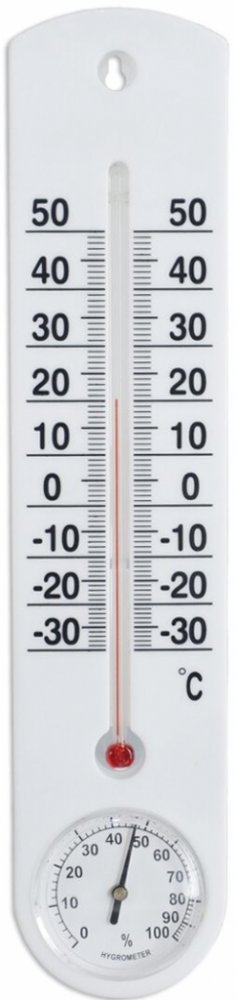 Teploměr s vlhkoměrem využijete pro měření venku i doma. Stupnice od - 30 °C do 50 °C, 0 - 100%. Materiál: plast PS. Rozměry: 5,5x1x25 cm.
