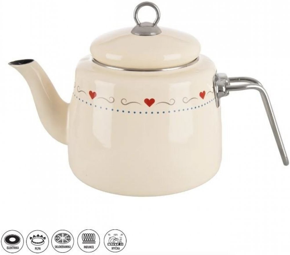 Rozměry: celkový objem 2 l, užitný objem 1,8 l, pr. 16,5 cm, celková výška 17 cm. Smaltované nádobí nabízí možnost zdravého vaření bez uvolňování nebezpečných a nežádoucích látek do jídel. Nádobí naakumuluje teplotu a dlouho ji udrží. Vyznačuje se dlouhou životností, zdravotní nezávadností pro alergiky, univerzálním použitím. Sortiment smaltovaného nádobí v provedení TONČA doplňuje nerezové kování, tato řada zahrnuje hrnce, kastroly, rendlík, dózy, džezvu a čajník. Čajník je opatřen pokličkou. Materiál: smaltovaný plech, nerez (lem), kov (rukojeť). Je vhodný na všechny typy spotřebičů včetně indukce, do myčky na nádobí. Není vhodný do MVT. Rozměry: celkový objem 2 l, užitný objem 1,8 l, pr. 16,5 cm, celková výška 17 cm.