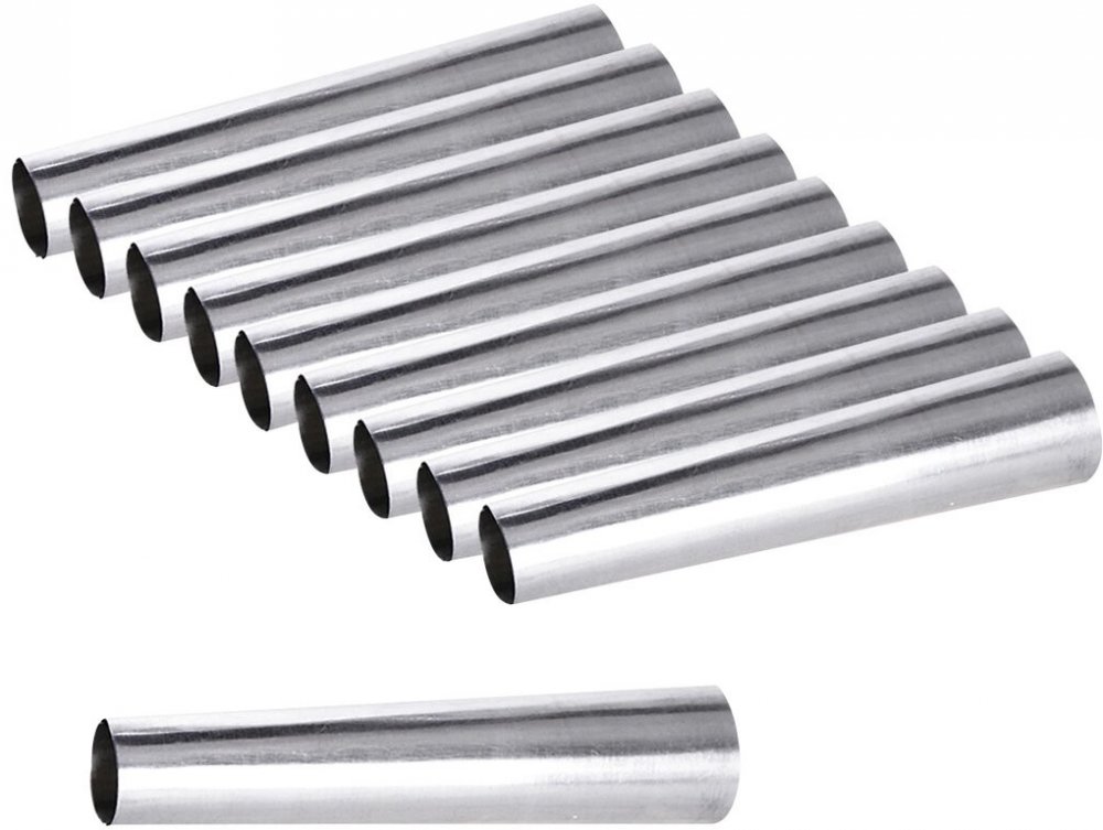 Trubičky na kremrole - sada 10 ks, mají kónický tvar pro snadnější snímání upečených trubiček, šátečků... Materiál: pocínovaný kov. Rozměry: pr. 1,5 cm/ 2,3 cm, d. 10 cm.