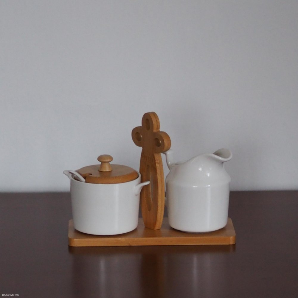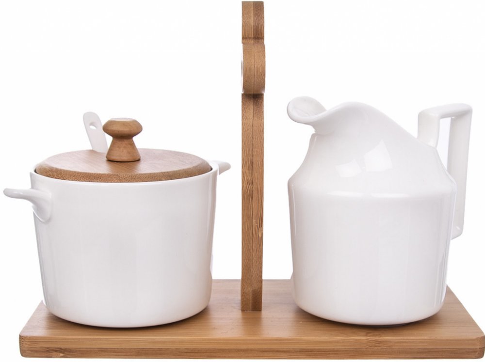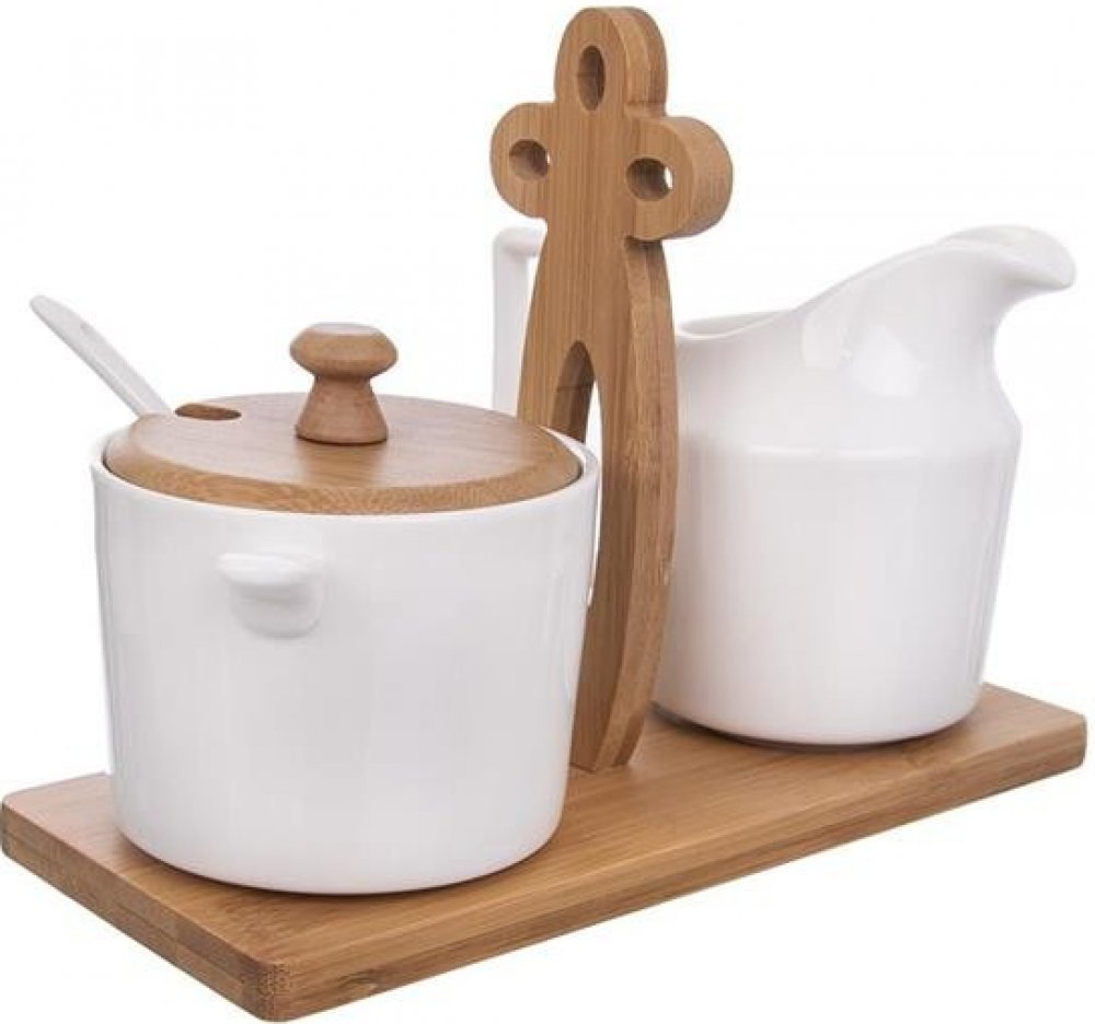 Krásně vypadající porcelánová mlékovka a cukřenka s vloženou lžičkou a bambusovým víčkem. Obě nádoby o objemu 0,28 l jsou usazeny v bambusovém stojanu s dekorativním držadlem.