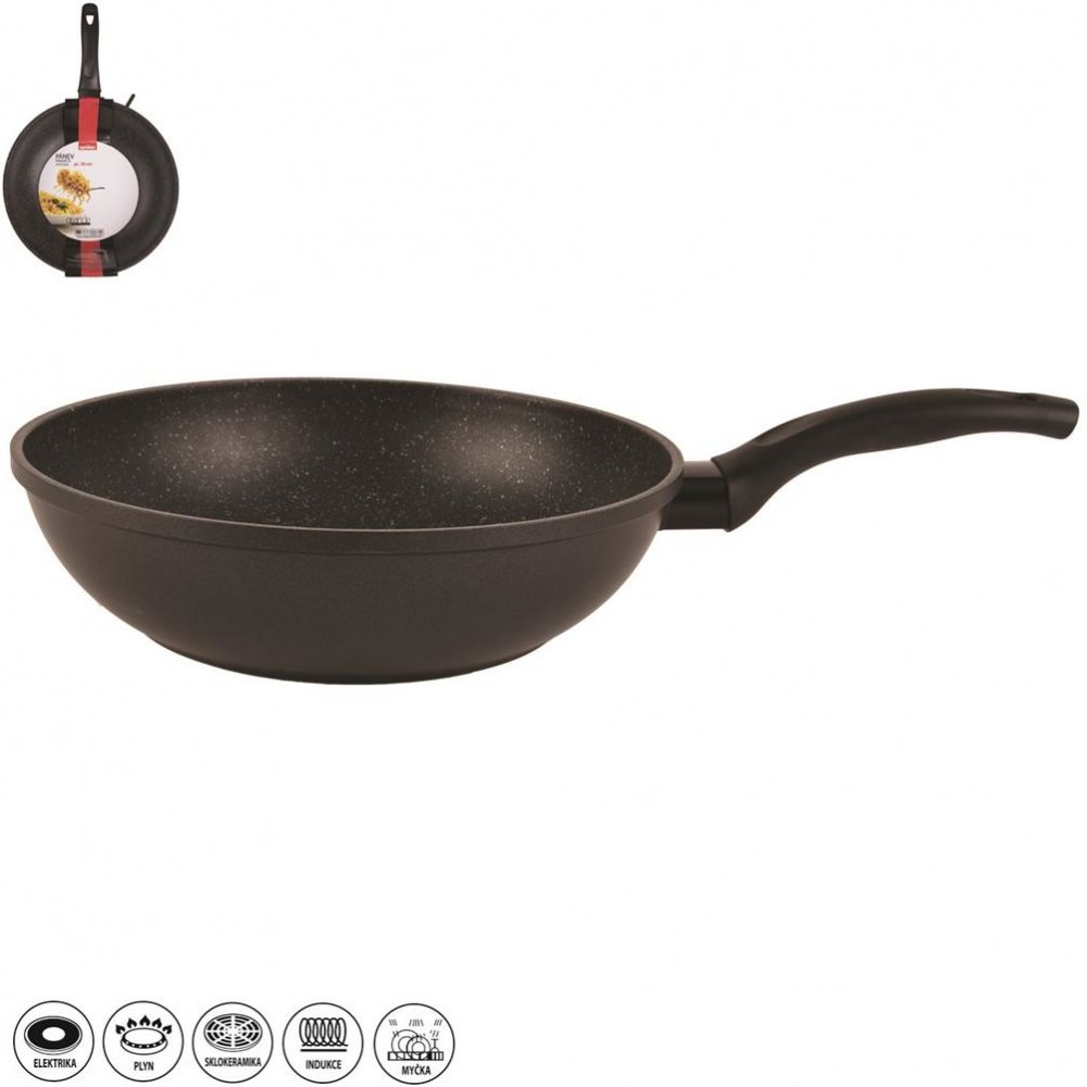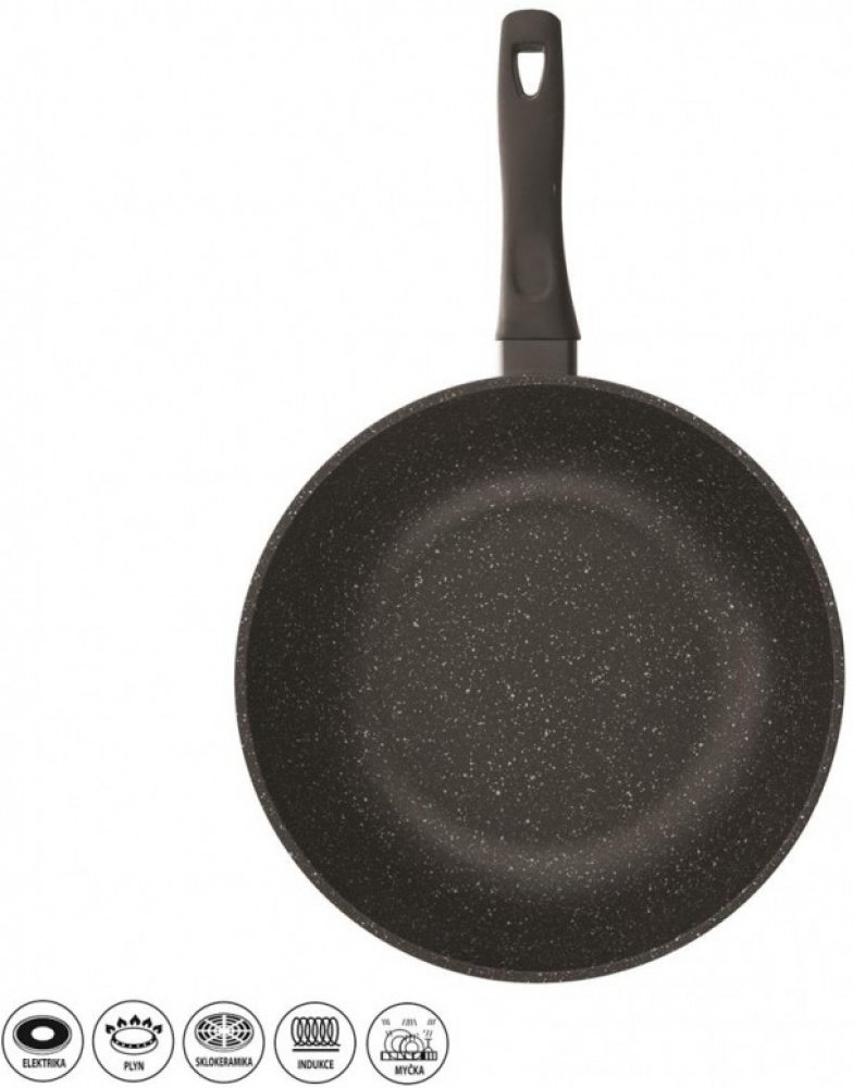 Spojení jednoduchého, ale účelného designu s kvalitou nepřilnavého povrchu dělá z této pánve wok perfektní kousek do každé domácnosti. Korpus této odlévané pánve je tvořen slitinou hliníku, která zajistí tvarovou stabilitu pánve, a je potažen kvalitním antiadhezním povrchem PFLUON GRANIT. Předností pánve wok je její široké použití. Základem vaření ve woku je rychlé restování stejně velkých kousků při vysoké teplotě. Krátce a intenzivně, v nepřilnavé pánvi rozšiřujícího se, kónického tvaru. Můžete připravovat marinované maso, mořské plody, zeleninu zalitou typickými asijskými omáčkami, prohozenou s nudlemi i rýží, i rychlovky z české kuchyně. Jídlo zůstane zvenčí křupavé, zatímco uvnitř bude božsky šťavnaté. Přednosti pánví GRANDE: kvalitní antiadhezní povrch PFLUON GRANIT zabraňující připékání pokrmů pevná rukojeť zajistí bezpečnou manipulaci kompatibilní se všemi druhy varných desek včetně indukce nevyžaduje tak vysoké teploty rozpálení jako nerez a litina silné sendvičové dno šetří energii možnost zavěšení lze umývat v myčce, avšak vlivem agresivních čisticích prostředků může dojít k nepatrné oxidaci (tento stav nemá vliv na proces vaření, není zdravotně závadný a nemůže být důvodem reklamace). Doporučujeme: Používejte velikost plotýnky úměrnou průměru dna a dřevěné, silikonové nebo nylonové náčiní. Objevte radost z vaření v nádobí Grande, další informace najdete zde >>