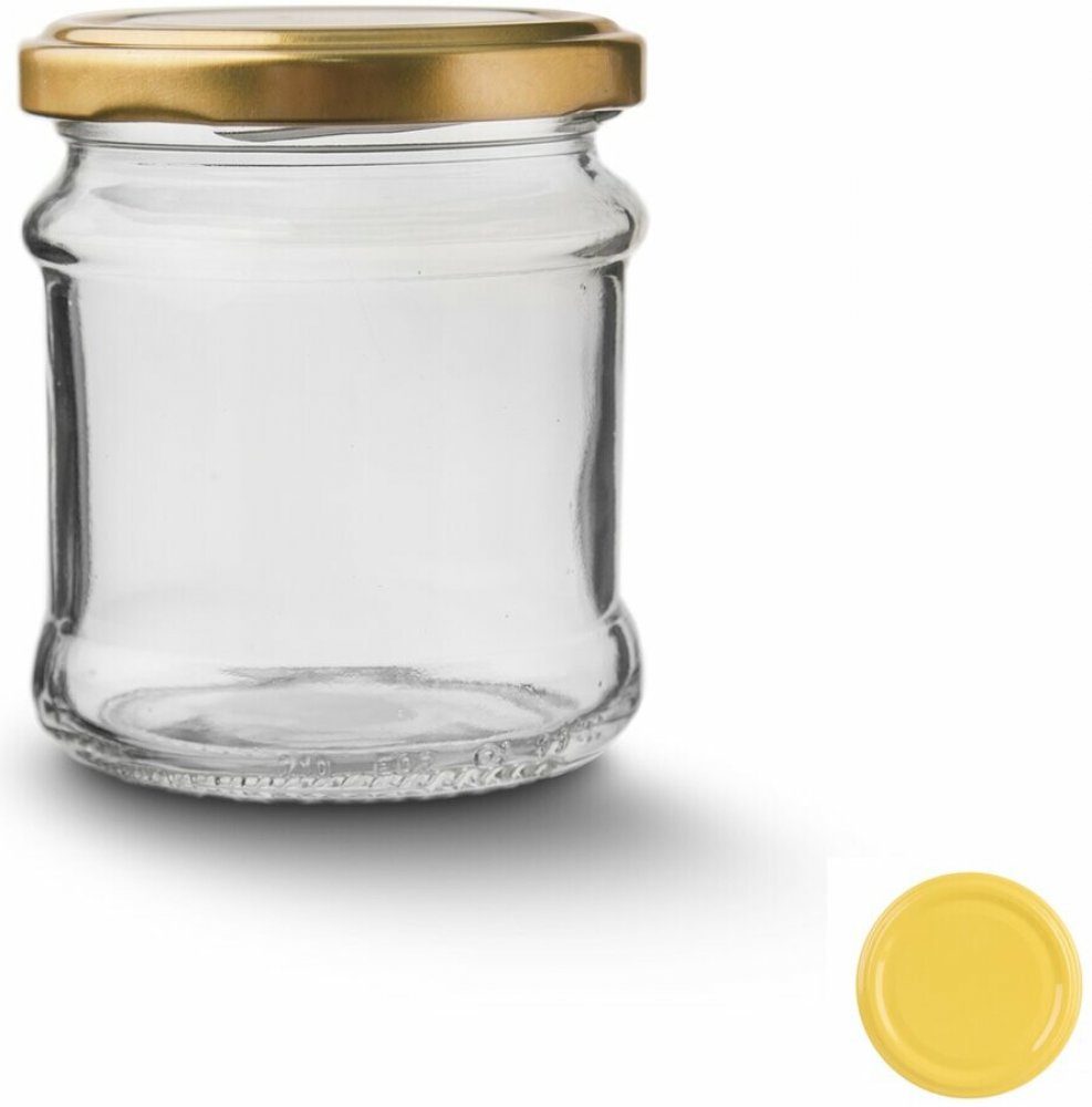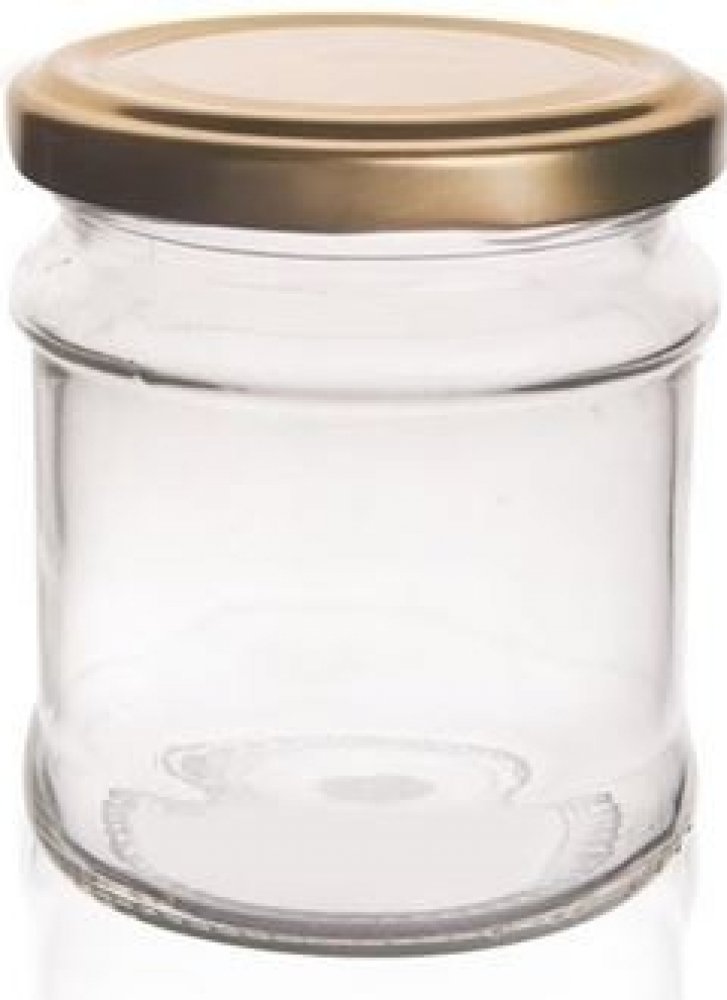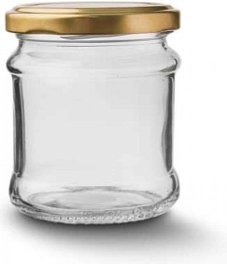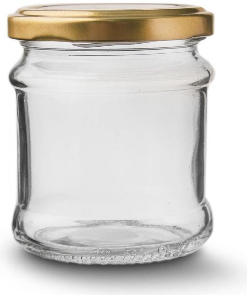 Zavařovací skleněná transparentní sklenice se závitem o objemu 0,212 l, s kovovým víčkem ve zlaté barvě.