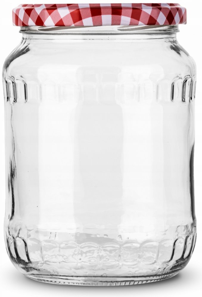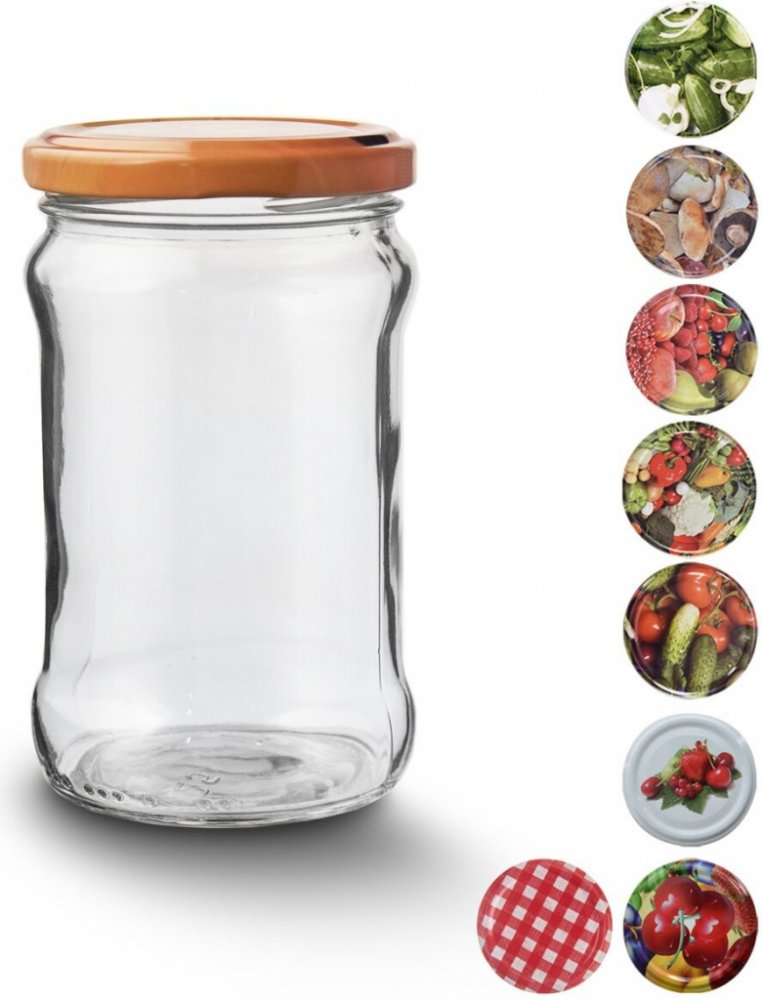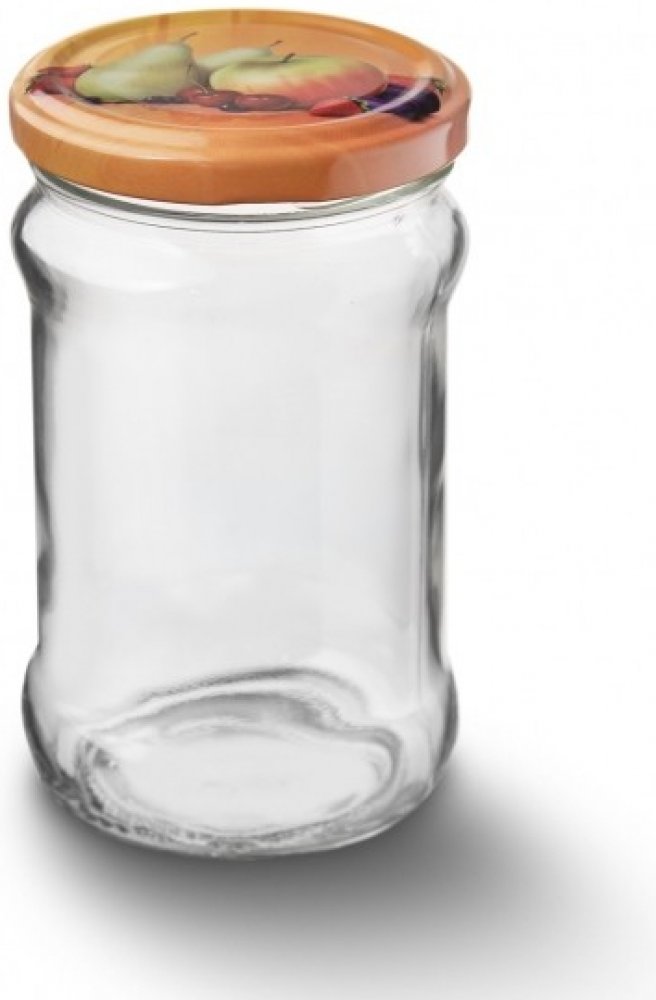 Zavařovací skleněná transparentní sklenice, o objemu 0,3 l. S barevným kovovým víčkem na závit v několika dekorech plných ovoce, zeleniny i hub.