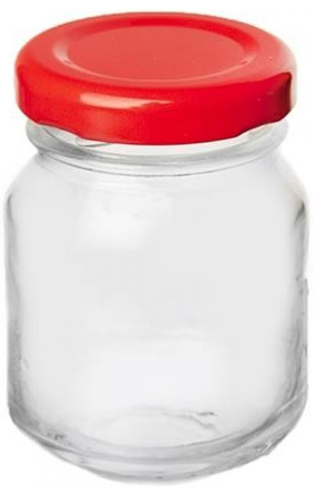 Zavařovací kulatá skleněná transparentní sklenička, s červeným kovovým víčkem na závit.