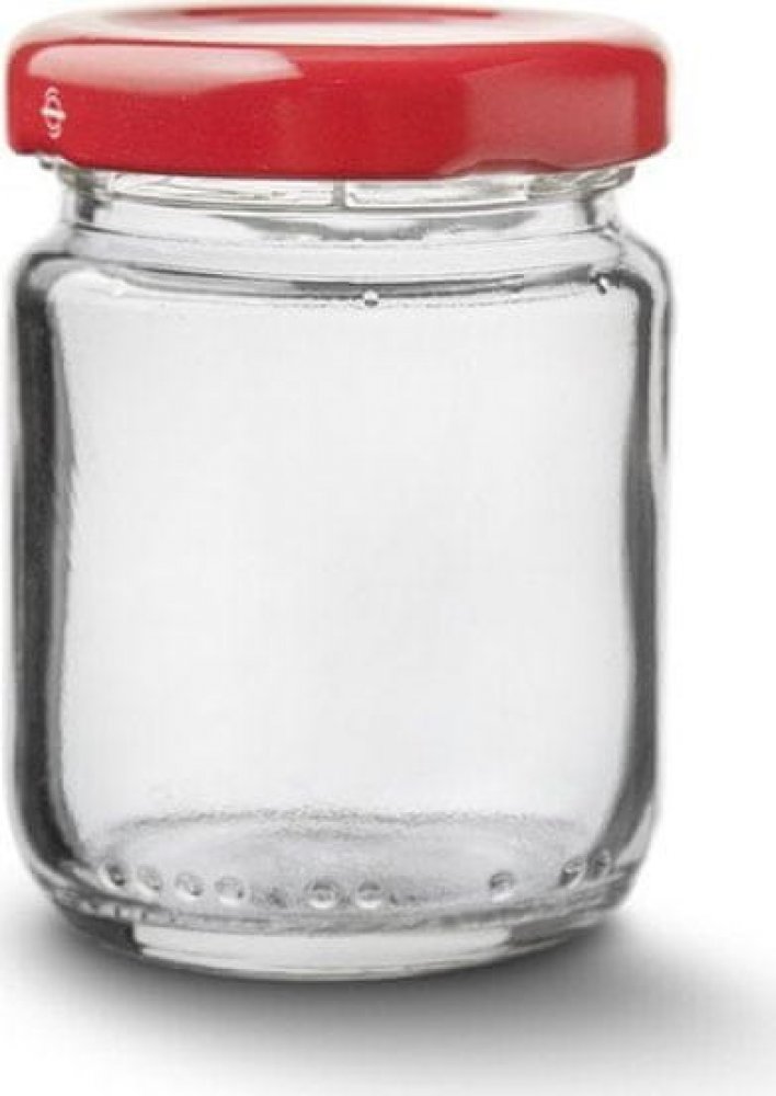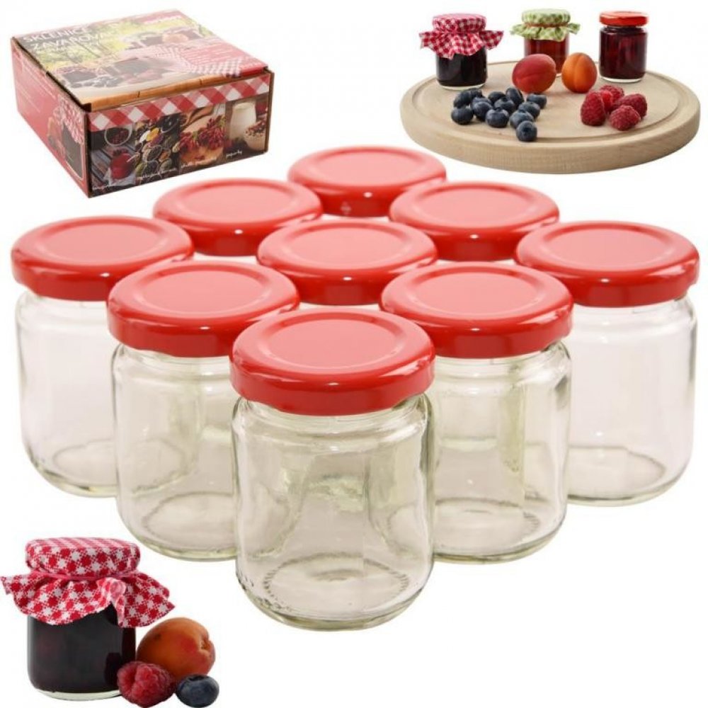 Zavařovací skleněná transparentní sklenička, s červeným kovovým víčkem na závit, v sadě 9 kusů.