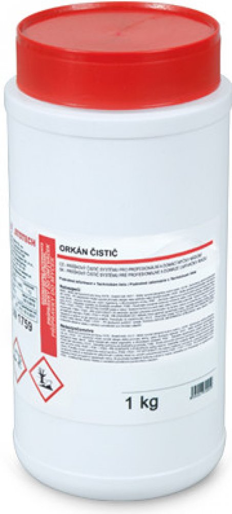 Práškový čisticí přípravek průmyslových a domácích myček nádobí na bázi aktivního chlóru.