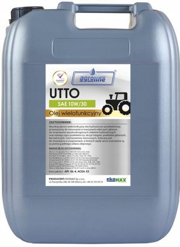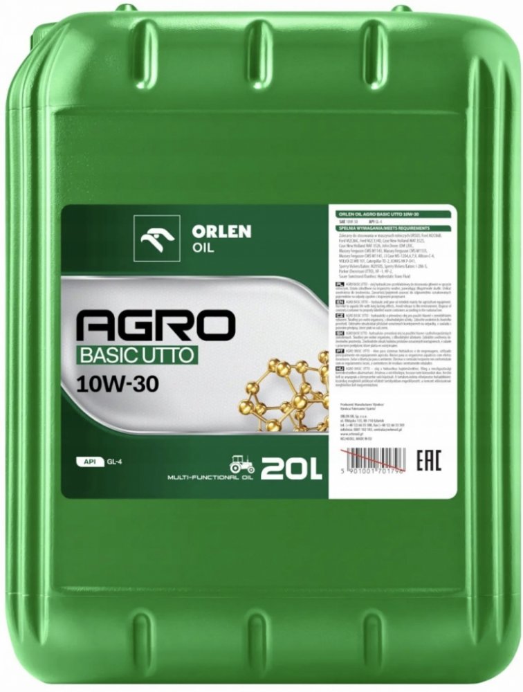 ORLEN OIL AGRO UTTO 10W-30 je určen k mazání různých druhů ozubených kol používaných v zemědělských zařízeních (převodovky, hlavní převodové stupně, kormidelní převodovky, diferenciální převodové stupně) a lze je použít ve vysoce zatěžovaných hydraulických systémech, splňuje požadavky výrobců zemědělských zařízení . Olej lze použít u traktorů, kde jsou mazány ruční převodovky, nápravy, hydraulická armatura a "mokré brzdy" jedním olejovým systémem.