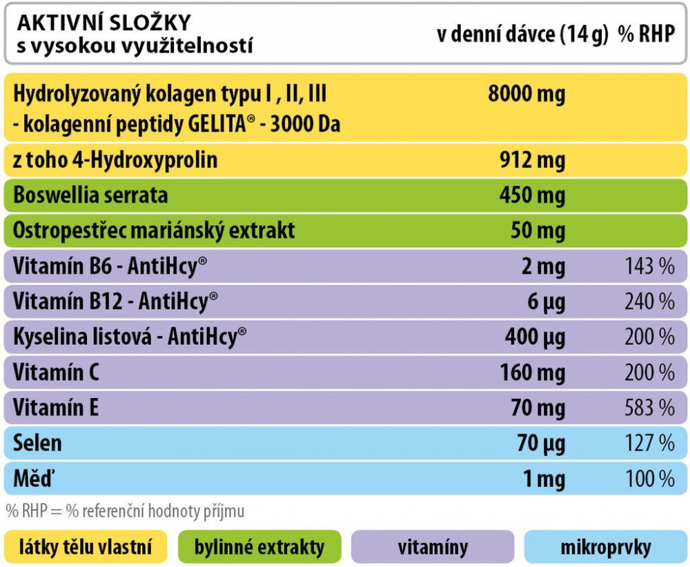 hydrolyzovaná kolagenní bílkovina (57 %), fruktóza (2,1 g v DD), sušená ovocná šťáva - černý rybíz, kyselina: kyselina citronová, syrovátka, Boswellia serrata extrakt, aroma, pektin, přírodní barvivo: betanin z červené řepy, vitamín C (kyselina L-askorbová), vitamín E (DL-?-tokoferyl-acetát), extrakt z ostropestřece mariánského, sladidlo: sukralosa, bisglycinát měďnatý, vitamín B12 (kyanokobalamin), vitamín B6 (pyridoxin-hydrochlorid), foláty - kyselina listová (kyselina pteroylmonoglutamová), L-seleno-methionin