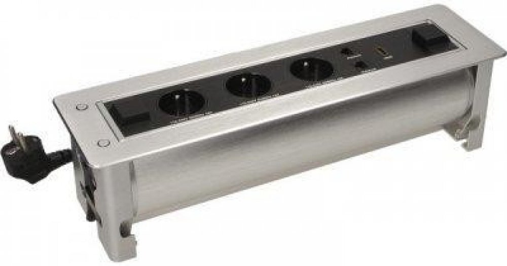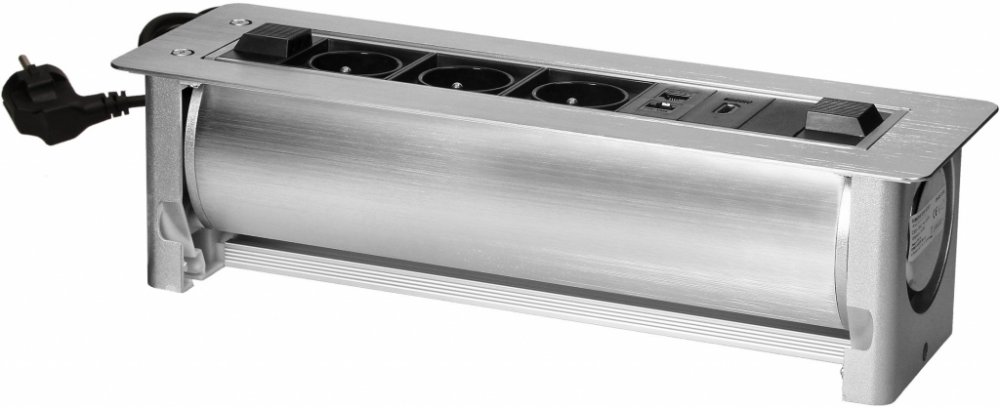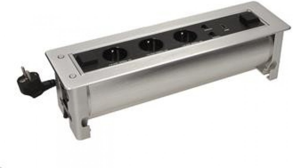 Univerzální hliníková, zásuvková skříňka s otočným zásuvkovým modulem. Je určena pro vestavbu do desky (stolu, kuchyňské desky, kancelářských sestav, předváděcích a výstavních pultů atd). Zásuvkový modul je ovládán vestavěným motorem a dvěma tlačítky (1. pro otevření, 2. pro zavření zásuvek). Tlačítka jsou podsvícena pro pohodlné ovládání i za snížené viditelnosti. Vestavěné 3 zásuvky 230V (max. z...
