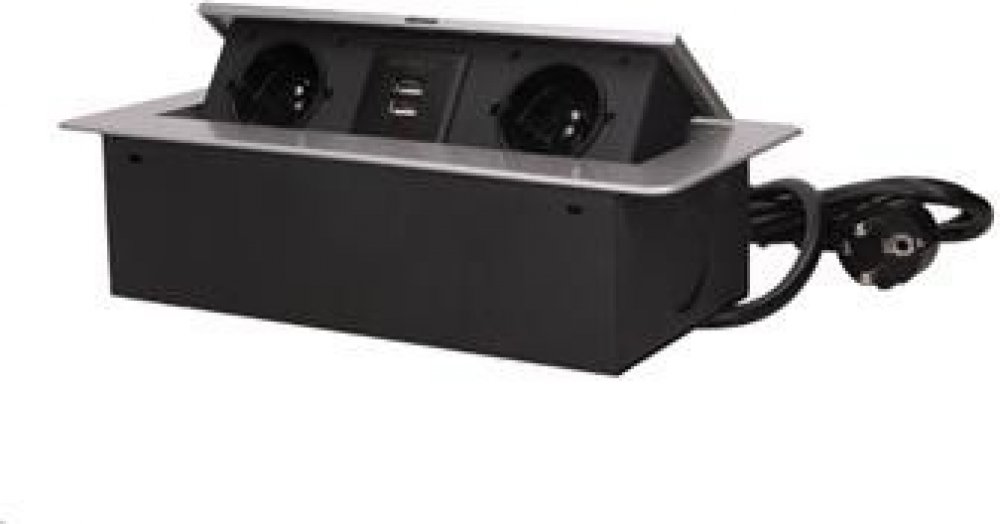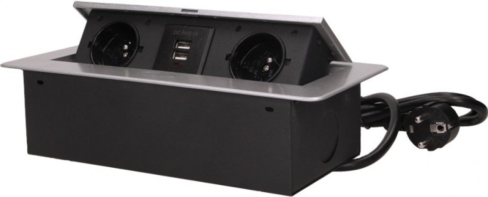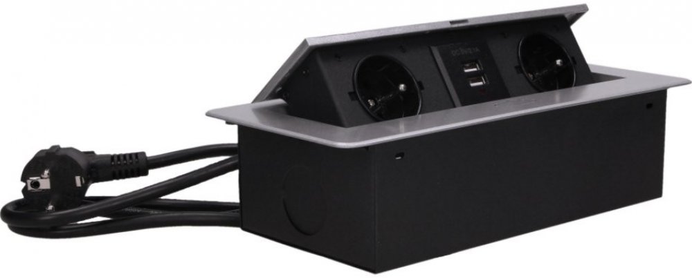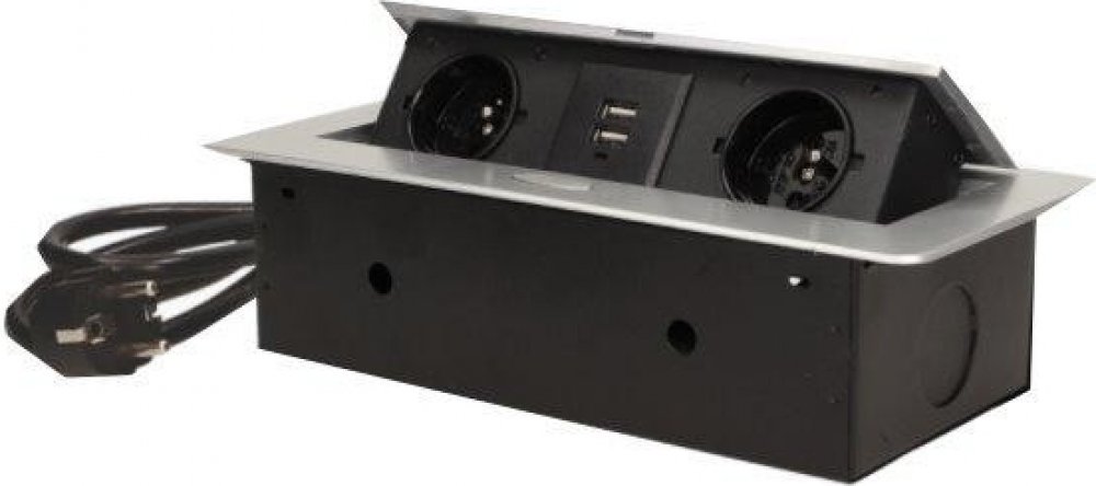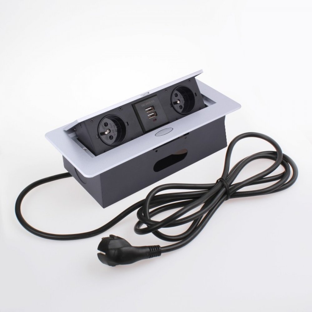 zásuvkový blok v stříbrné barvě určený pro vnitřní instalaci do stolů,