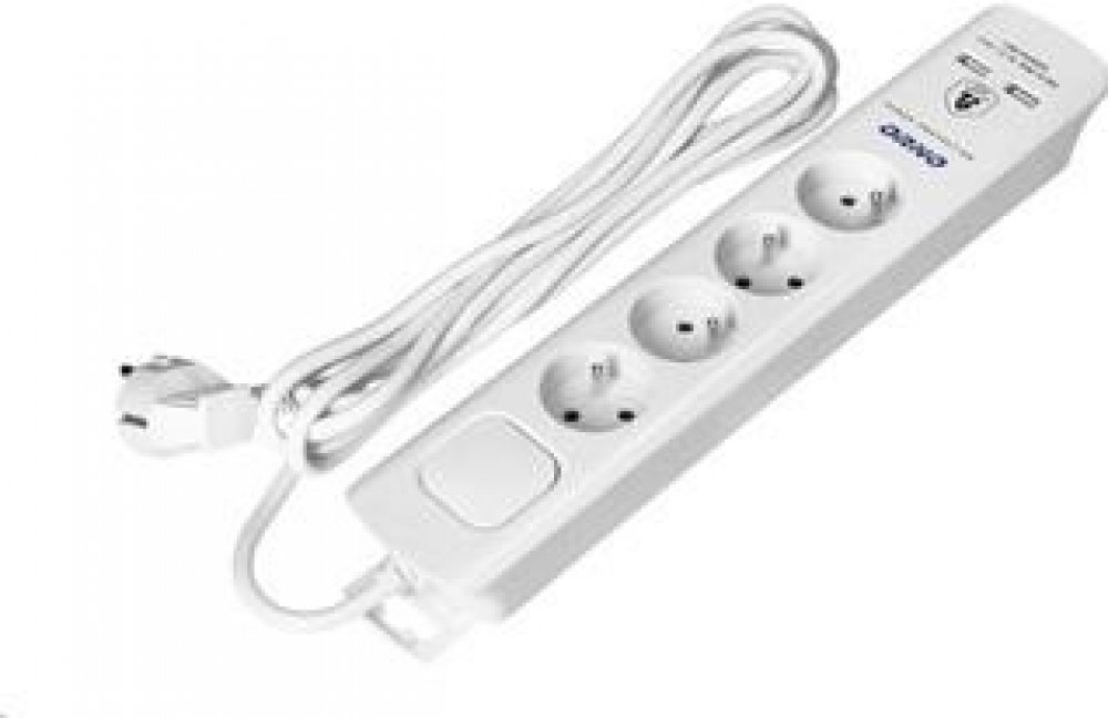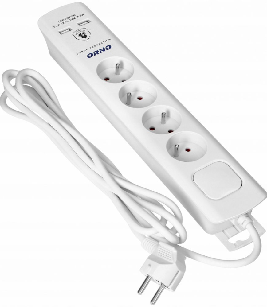 Přepěťová ochrana s 3metrovým kabelem nám umožňuje připojit 4 elektrická zařízení o celkovém příkonu 2300W. Napájení lze vypnout dvoustopým osvětleným hlavním vypínačem. Zařízení účinně chrání naše zařízení proti přepětím způsobeným povětrnostními podmínkami nebo výpadky sítě. Má 2 USB vstupy.