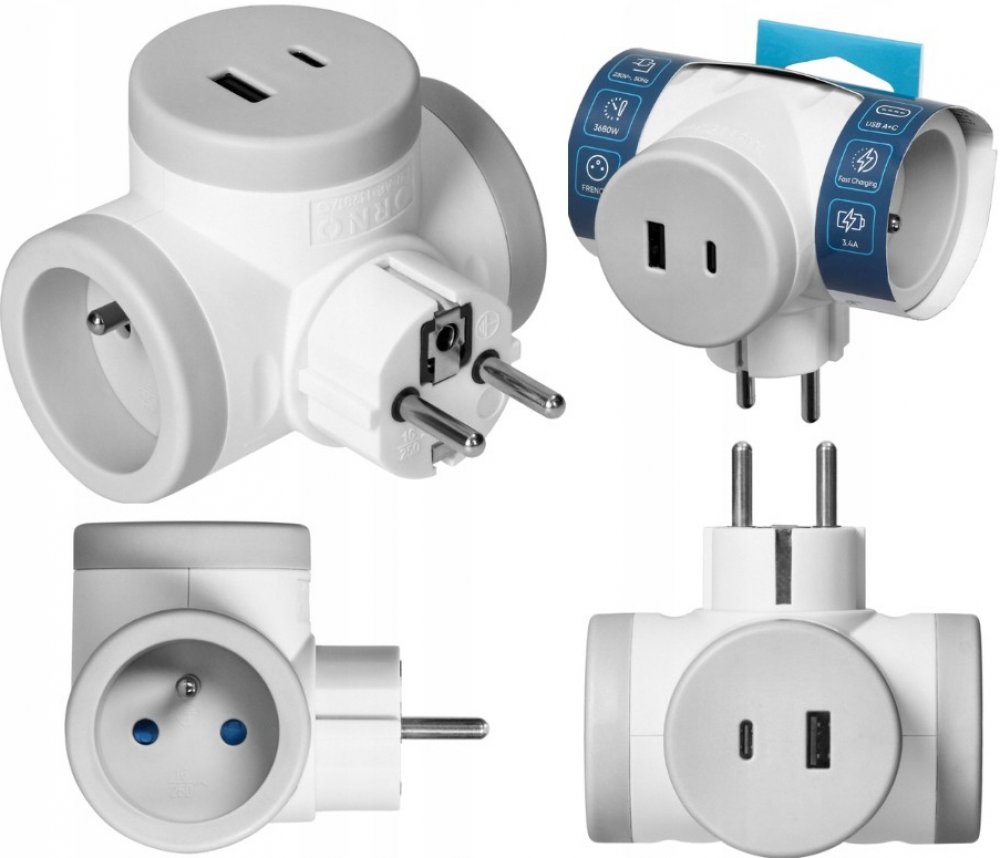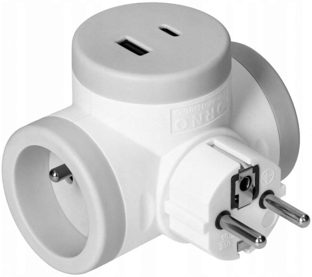 Elektrický rozbočovací zásuvka, která umožňuje připojení dvou elektrických zařízení a současně použití dvou portů USB (typ A a C).
