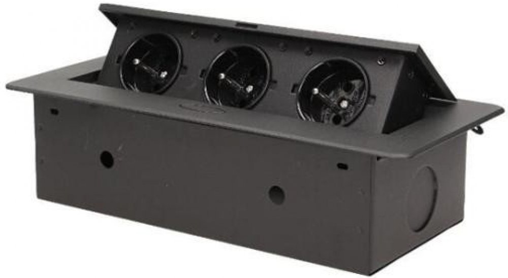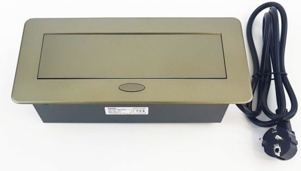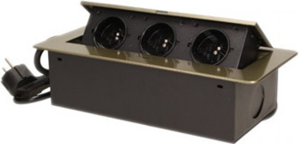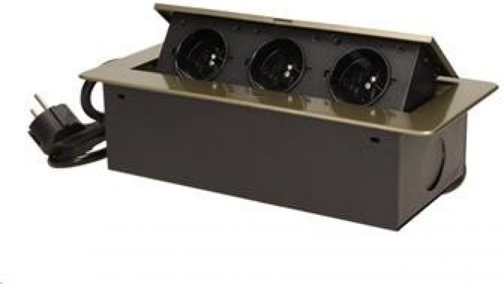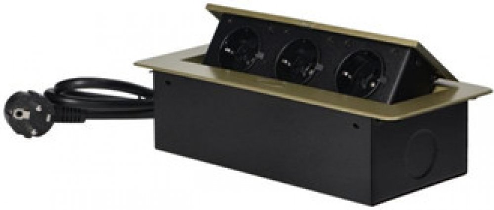 Sada tří síťových zásuvek s uzemněním Schuko a proudovou ochranou v krytu skrytém v horní části. Zařízení je určeno pro instalaci do pracovních stolů, pracovních desek a stolů, lze jej namontovat svisle i vodorovně a poskytuje pohodlný přístup k elektrickým zásuvkám. Díky ploché hraně (pouze 2 mm) pouzdro s objímkami dokonale zapadne do povrchu např. stůl a nepřekáží při jeho čištění. Má uzavřený panel se síťovými zásuvkami a 1,5 m dlouhým kabelem. Barva: mosaz.