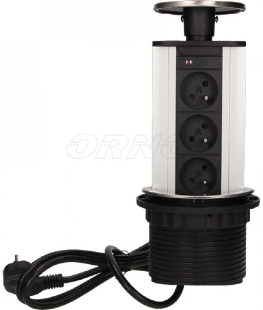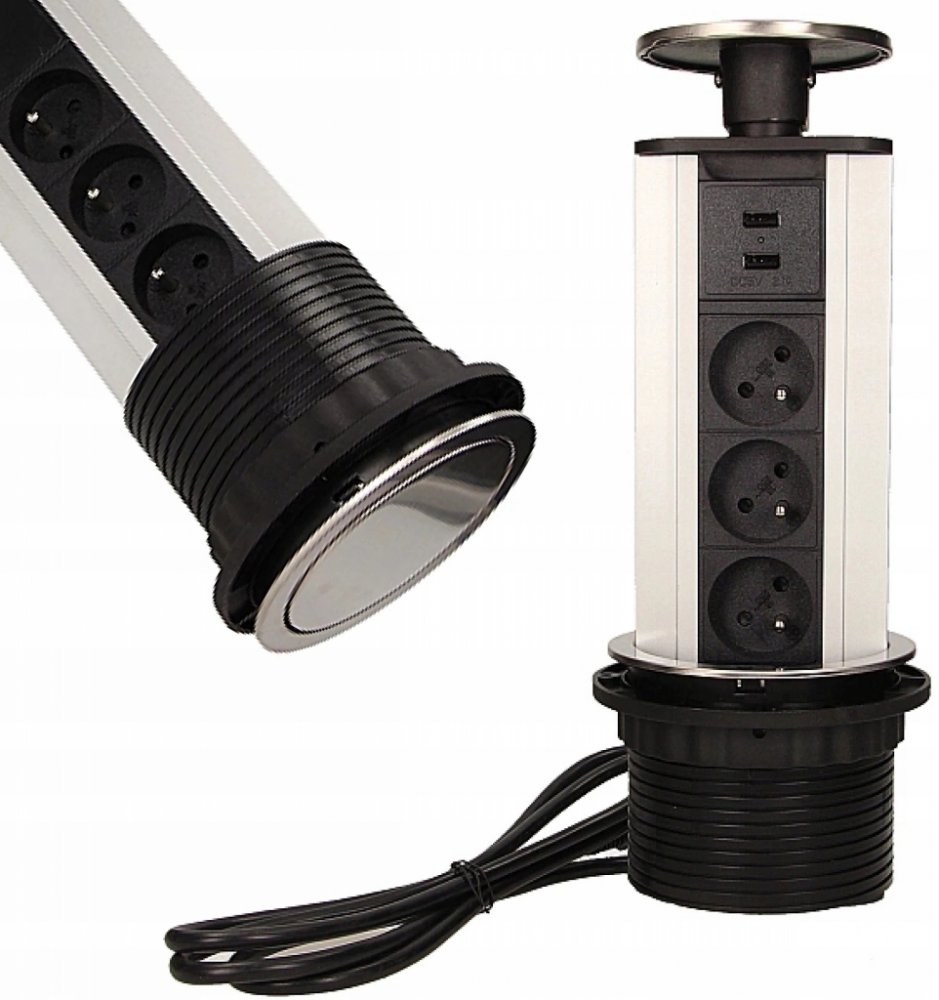 Nábytková zásuvka 10cm, 3x250V AC výklopná do pracovní desky s USB nabíječkou a kabelem 1,8 m, INOX, Orno OR-AE-1354