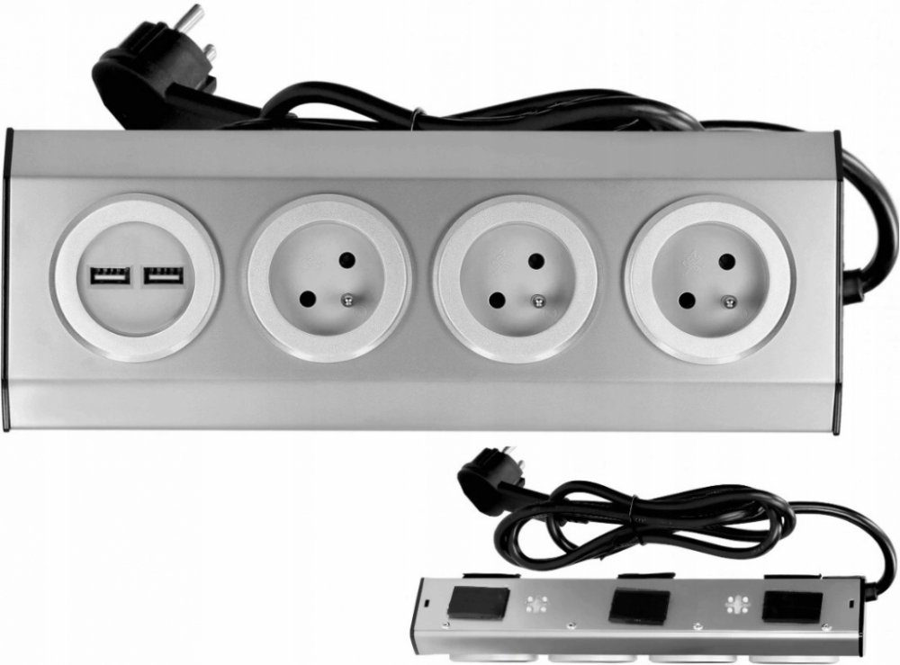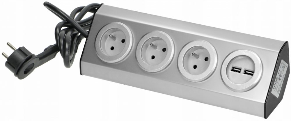 Nábytková zásuvka VIRONE FS-4 má 3 síťové zásuvky s uzemněním, dvojitý USB port a 1,5 m dlouhý kabel. Je vhodný pro použití v kuchyni nebo kanceláři - jak na rovné plochy, tak i do rohů. Montují se velmi jednoduše - suchým zipem. Zajišťují stabilitu a šetří čas. Pouzdro je vyrobeno z nerezové oceli INOX, díky čemuž se vyznačuje vysokou odolností a stylovým vzhledem