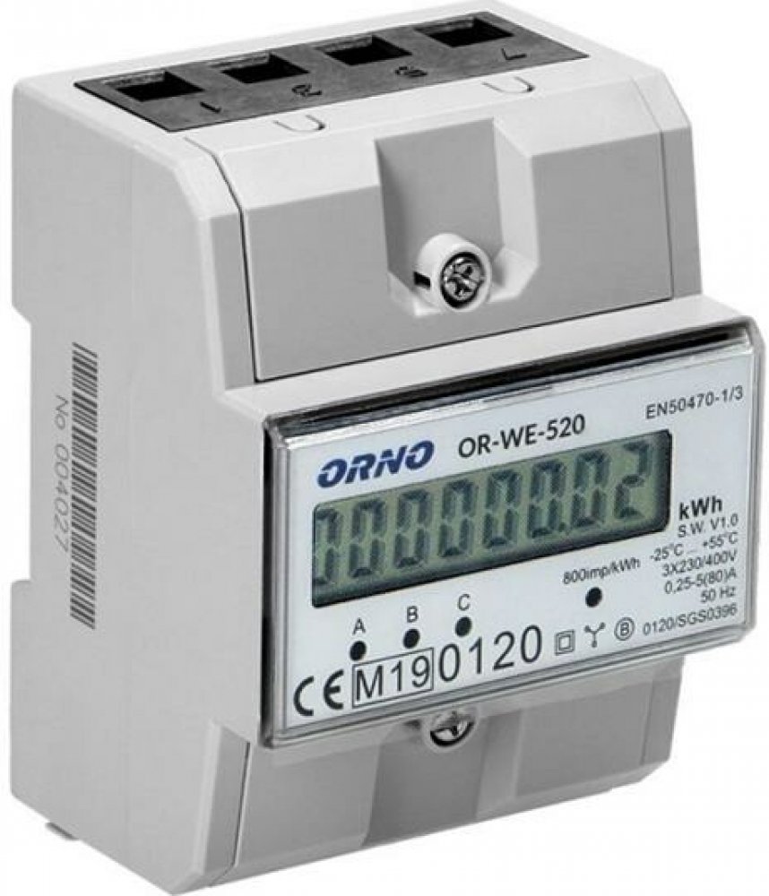 Zařízení pro indikaci v metrických jednotkách (kWh) se používá pro přímé měření činného výkonu ve třífázovém systému. Speciální elektronický obvod pod vlivem proudícího proudu a aplikovaného napětí generuje impulsy v množství přiměřeném spotřebované elektřině. Příkon ve fázi je signalizován blikáním LED diody. Počet pulzů se převádí na spotřebovanou energii a jeho hodnota je indikována LCD displejem (6 + 2). Napájení: 230V~, 50Hz, základní proud: 5A, Max. Proud: 80A, min. proud: 0.25A, impulsní frekvence: 800 imp/kWh, třída přesnosti B, pouzdro o šířce tří modulů, montáž na DIN lištu 35 mm, impulsní výstup: 12 ~ 27V napájení, proud ?27mA, impuls = 80ms. Měření energie se provádí podle norem EN50470-1: 2006, EN50470-3: 2006 směrnice MID 2014/32 / EU.
