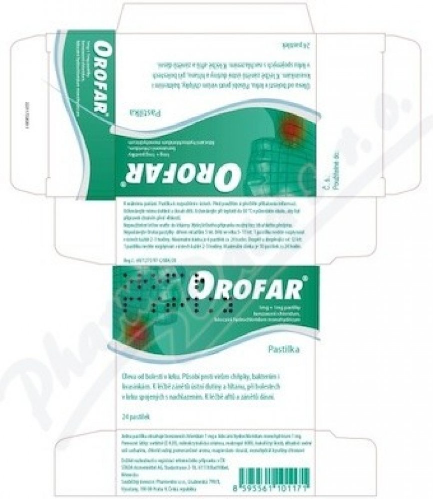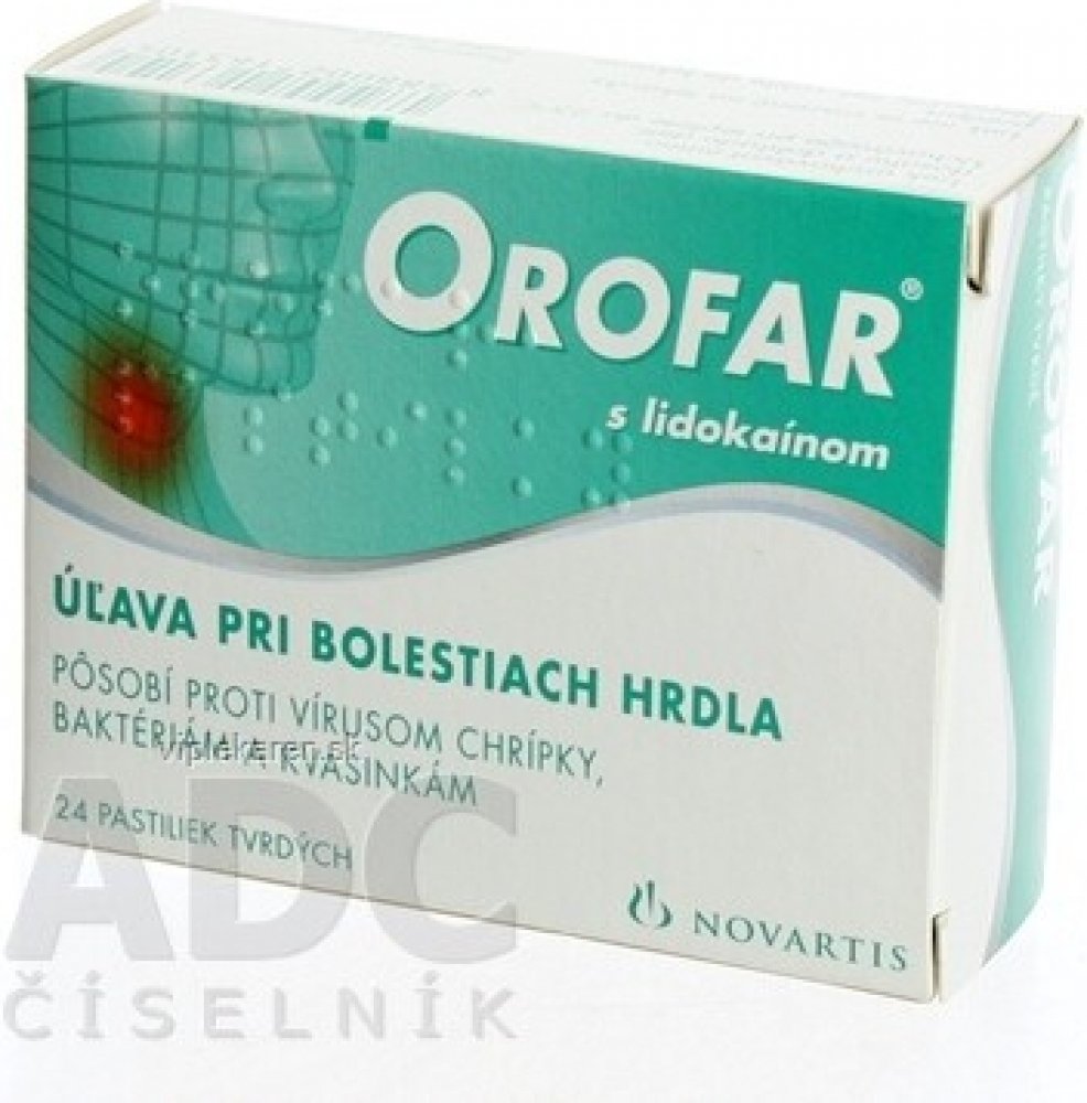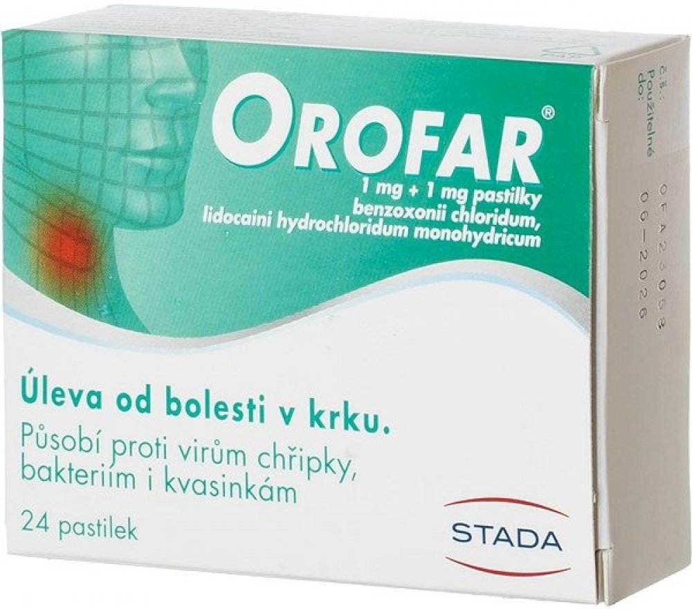 Orofar pastilky: benzoxonii chloridum 1 mg + lidocaini hydrochloridum 1 mg