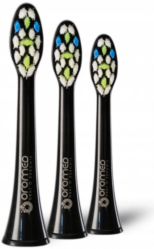 Sada tří originálních hlavic v černé barvě, určených pro sonické zubní kartáčky ORO-NEXT. Hlavičky jsou navrženy tak, aby účinně odstraňovaly zabarvení a zubní plak a dosahovaly těžko přístupných míst a zároveň byly šetrné k sklovině a dásním