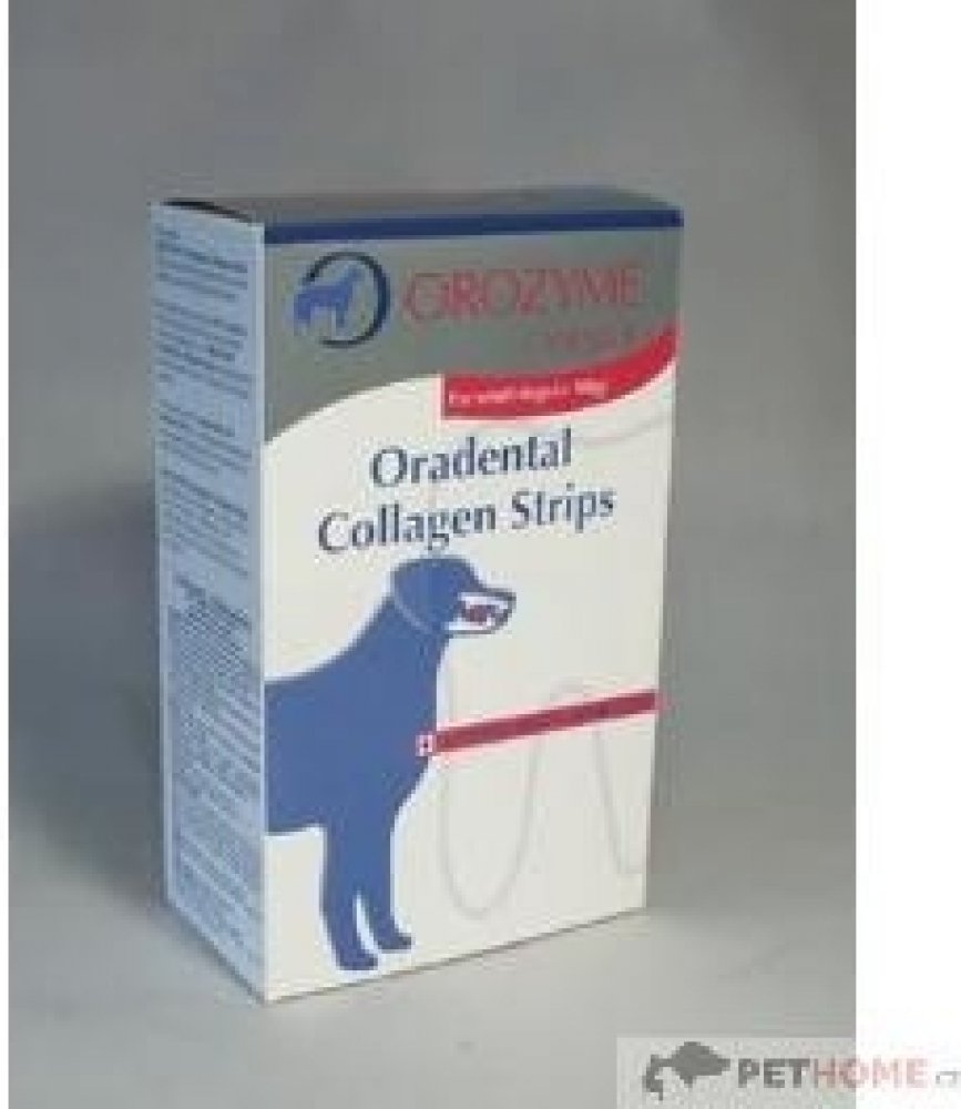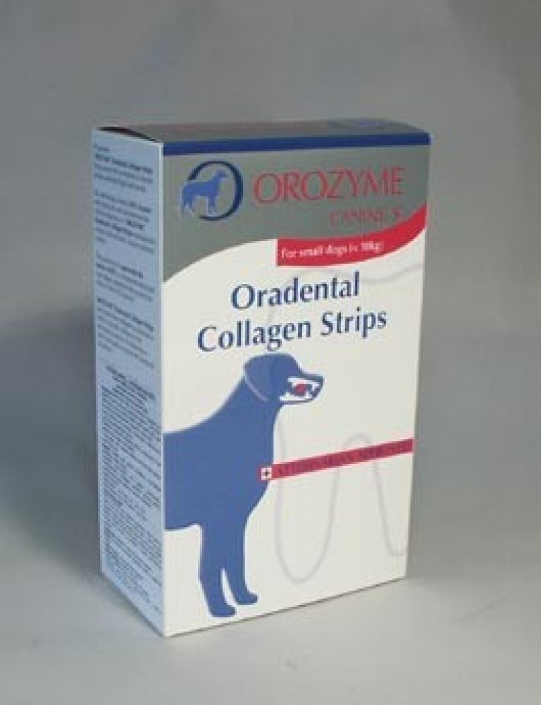 Žvýkací kolagenové plátky pro psy obsahující přírodní enzymy. Žvýkací plátky pro psy z kolagenu, který přirozeně stimuluje žvýkání. Jsou účinné k prevenci zubního plaku a ke zvýšení pevnosti dásní. Obsahují sušenou syrovátku – přírodní zdroj laktoperoxidázy a laktoferinu. Složení: hovězí kůže, hydrolyzovaný kukuřičný lepek, syrovátkový prášek. Analytické složky: hrubý protein 75,1 %, hrubý tuk 4,10 %, hrubá vláknina Dávkování: Podávejte plátky psovi každý večer po posledním jídle. Plátek nechte psovi žvýkat po dobu 10 – 15 minut, poté plátek psovi odeberte. Doporučujeme čistit zuby denně Orozyme zubním gelem. Pečlivě dodržujte rady vašeho veterinárního lékaře o dentální a ústní hygieně. Upozornění: Buďte opatrní u hltavých psů. Nedostatečné žvýkání může vést k dušení nebo zvracení. Přizpůsobte velikost plátku váze psa a sledujte chování při žvýkání. U hltavých psů je nejvhodnější podávat plátek po jídle. Skladování: Skladujte v suchu při pokojové teplotě. Balení vždy pečlivě uzavřete.