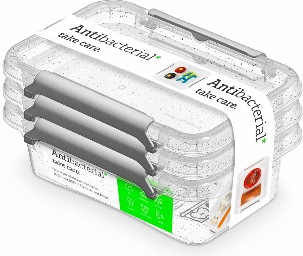Sada plastových dóz NANO box 350 ml, 3 ksSada plastových dóz NANO box o objemu 350 ml je určená pro skladování potravin. Dózy obsahují nanočástice stříbra, které zabraňují přenosu bakterií a plísní. Díky této technologii jsou dózy vhodné zejména pro alergiky.